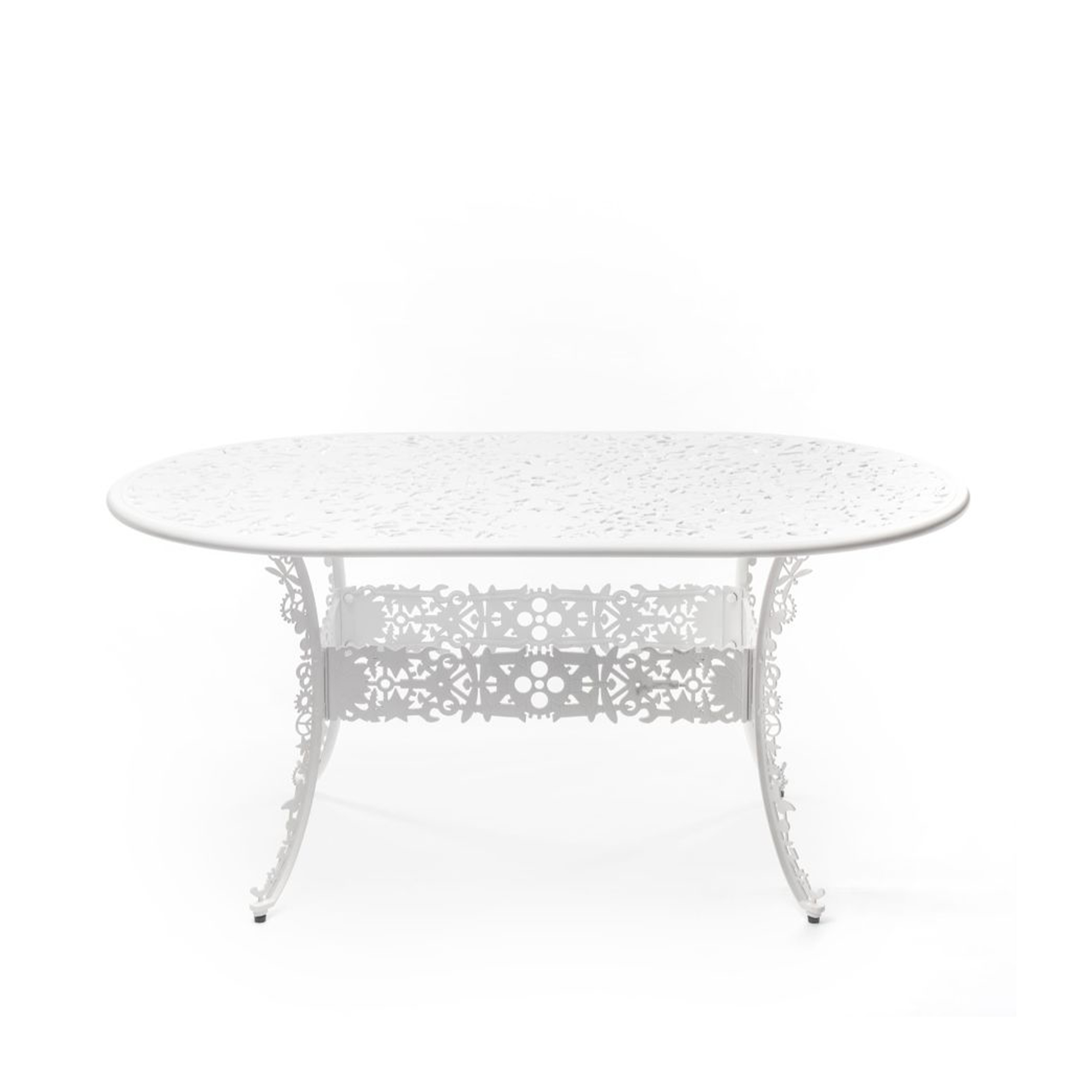 Aluminium Oval Table Industry Collection från Seletti är ett bord som kombinerar romantiska och tidlösa former från en klassisk viktoriansk trädgårdsdesign. Bordet är designat av Studio Job och har dekorationer som tydligt representerar popstilens lekfulla uttryck. Den klassiska trädgårdsestetiken får en twist, vilket förvandlar möbeln till ett verkligt konstverk med bucolisk känsla. Aluminium Oval Table är en del av en kollektion där traditionella former möter moderna och konstnärliga inslag, vilket gör den till ett unikt tillskott för utomhusmiljöer.