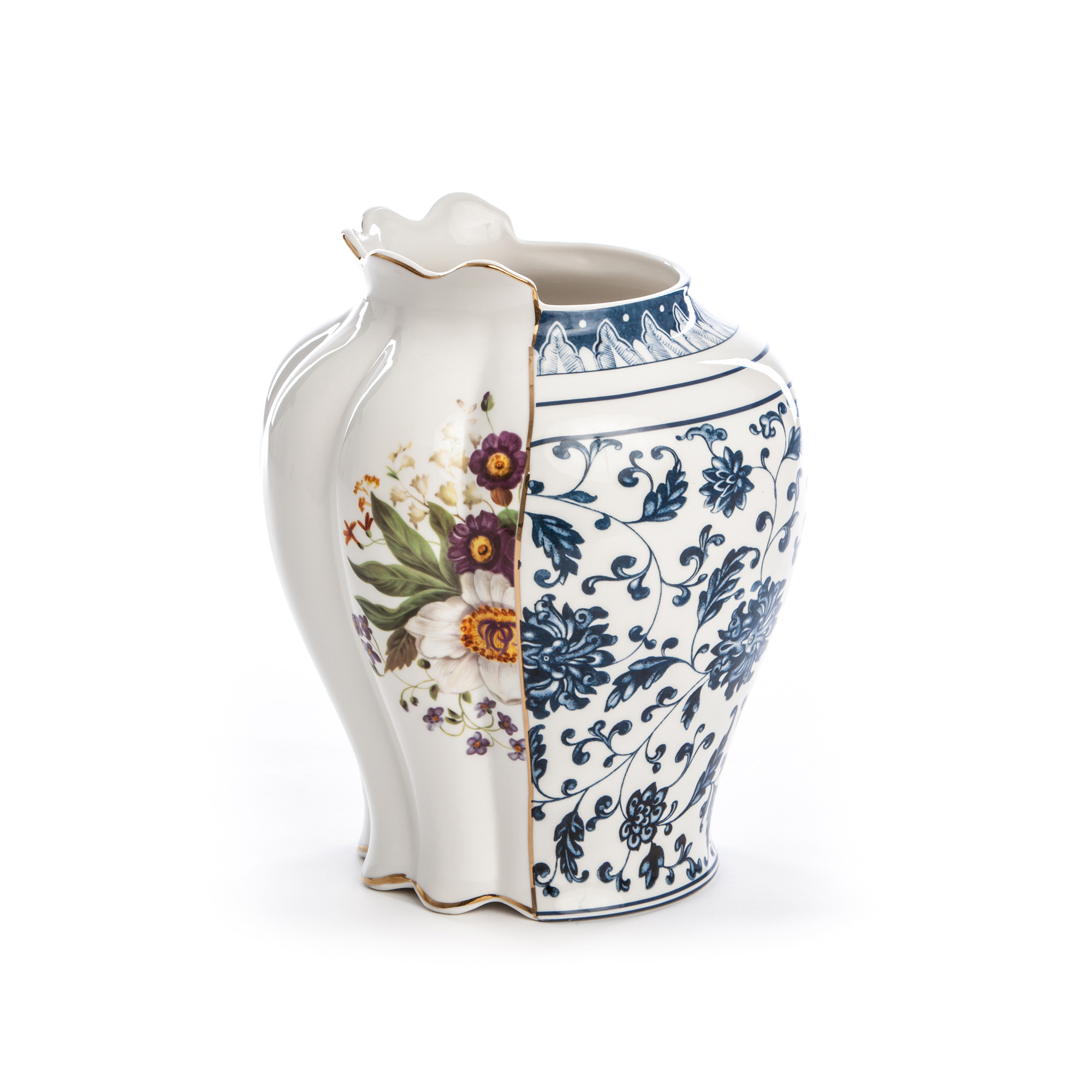 Hybridvasen Melania, skapad av Ctrlzak för märket Seletti, utgör en visuell fusion av östliga och västliga estetiska traditioner. Tillverkad i finaste porslin, representerar denna vas en harmonisk sammansmältning av olika kulturella designelement. Selettis Hybrid-serie återspeglar en lång tradition av keramiskt hantverk från världens olika hörn. Med sin sfäriska form är Melania idealisk för att framhäva alla sorters blomsterarrangemang. Som en enskild dekorativ accent i bostaden gör sig vasen likaså imponerande. Hybridvasen Melania kombinerar två distinkta halvor, var och en med sin egen unika estetik. Den ena sidan presenterar en subtil bas med ett motiv av en blomsterarrangemang och en sofistikerad guldkant. Den andra sidan av vasen är utsmyckad med ett mönster av små blå blommor.