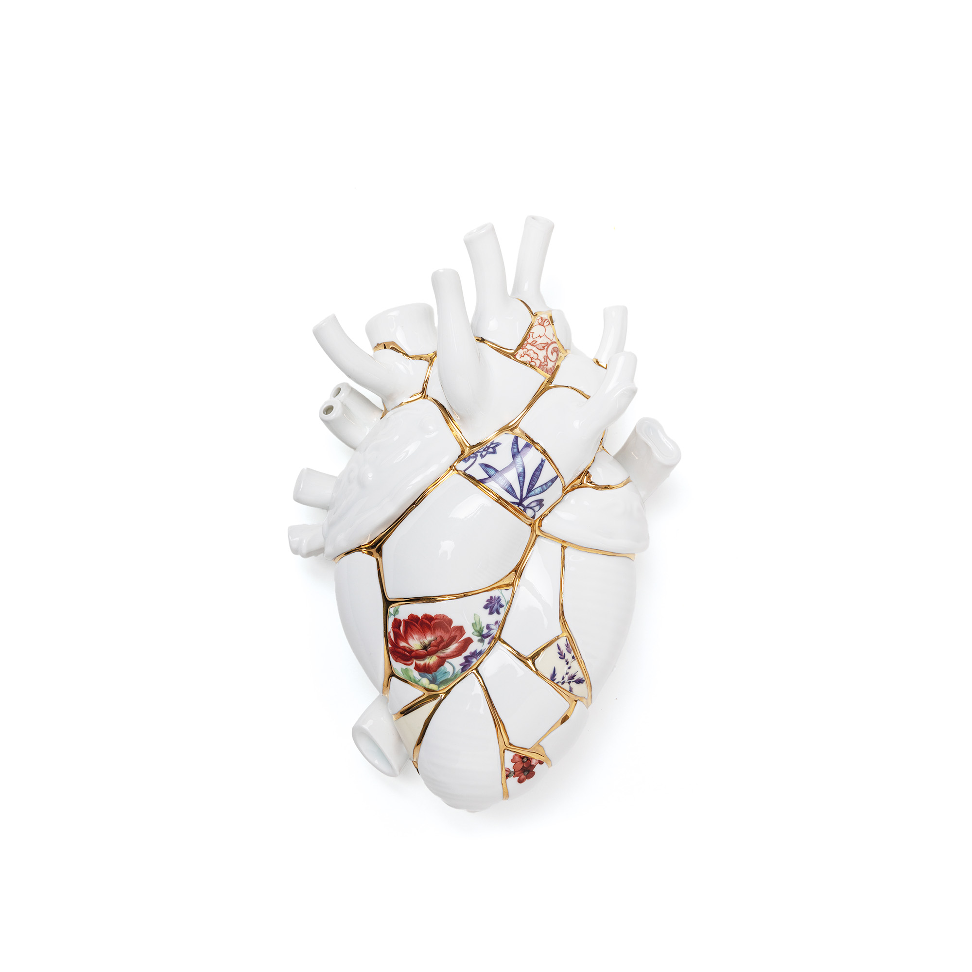 Love In A Box Kintusgi, skapad av designern Marcantonio för det anrika italienska märket Seletti, är en vas formgiven som ett mänskligt hjärta. Denna porslinsvas står ut med sin lekfulla och uppmärksamhetsväckande estetik, vilket är typiskt för Selettis designfilosofi. Dess utsmyckningar med gulddetaljer och mönstrade keramikfragment påminner om en omsorgsfullt reparerad vas. Med Love In A Box Kintusgi kan du anpassa dina blomsterarrangemang tack vare vasens förmåga att hålla olika tjocklekar på blomstjälkar. Denna unika vas är en idealisk gåva som symboliserar att ge bort sitt hjärta, i både konkret och överförd bemärkelse, till någon speciell. Marcantonios arbete är en fusion av svart humor och personlighet, med en ambition att skapa förundran. Det är en fascinerande blandning av anatomi och romantik.