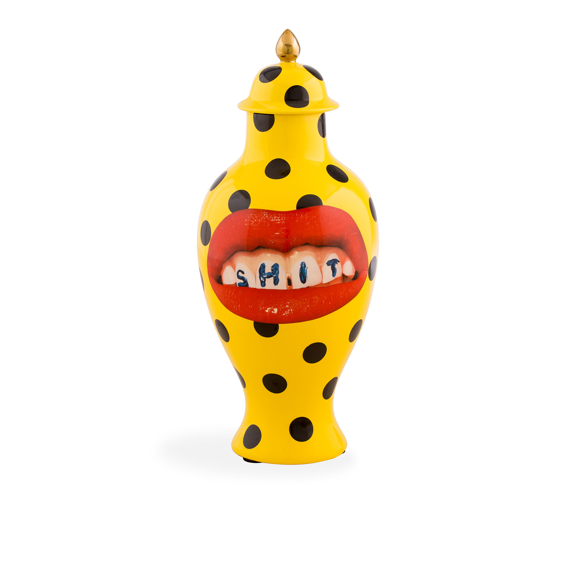 Vasen – Shit, designad av Toiletpaper Home, är ett framträdande stycke i Selettis italienska designsortiment. Denna vas är skapad i fin porslin och dess silhuett påminner om klassiska antika former. Ytan på Vasen – Shit är täckt av en lysande gul glasyr, dekorerad med svarta punkter och ett iögonfallande munmotiv där ordet shit är illustrerat på tänderna. Ett lock avslutar vasens design, toppat med en elegant guldfärgad knopp. Vasen – Shit utstrålar skönhet, oavsett om den är fylld med en bukett blommor eller står för sig själv som en distinkt dekorativ detalj. Det unika samarbetet mellan Seletti och Toiletpaper lanserades 2014 och resulterade i en kalejdoskopisk heminredningskollektion som erbjuder objekt som bryter mot det konventionella och introducerar en ny dimension av stil i hemmet.