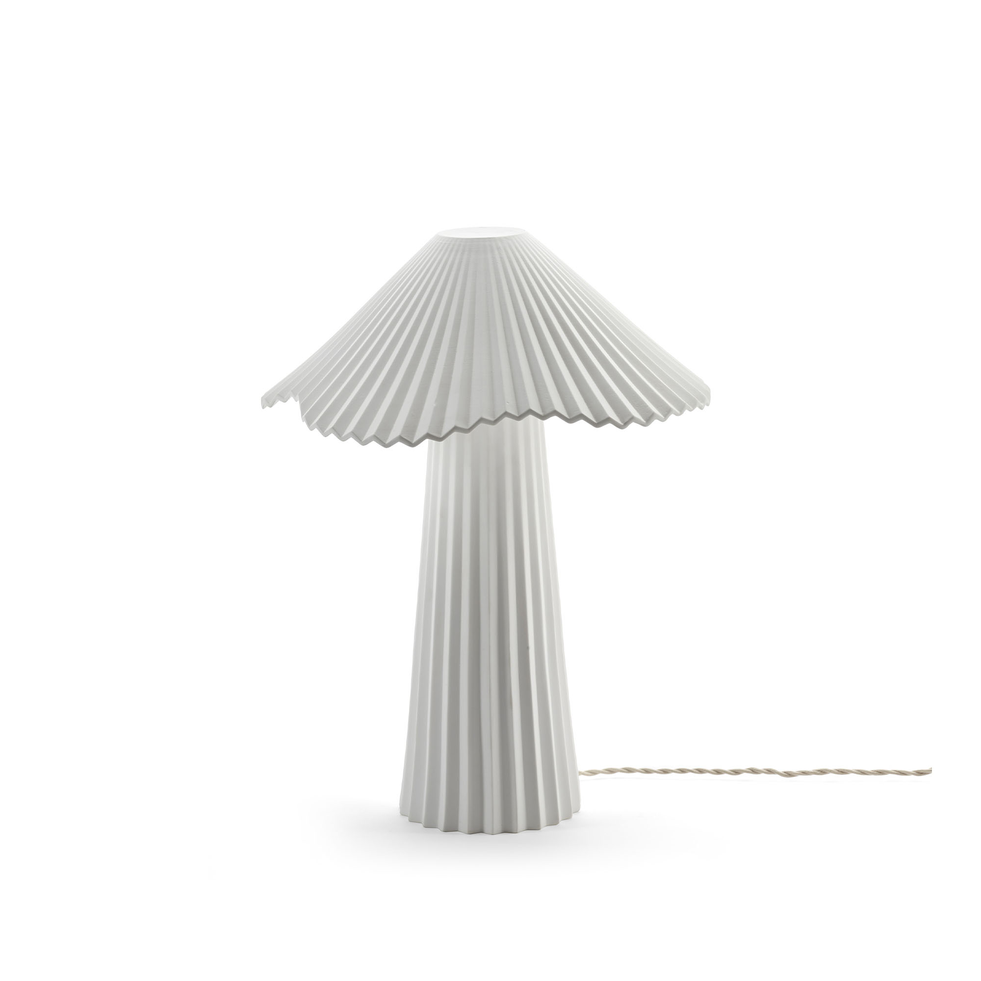 Uala bordslampa L är en lampa från det belgiska varumärket Serax. Produkten är designad av Sebastian Herkner och inspirerad av de veckade bladen på Licuala Grandis, även kallad Ruffled Palm. Lampskärmen är tillverkad i porslin och formad för hand med en mjukt böljande yta som antyder rörelse. Den större storleken gör lampan lämplig som belysning på bord eller skänk. Produkten är avsedd för inomhusbruk och levereras utan tillbehör.