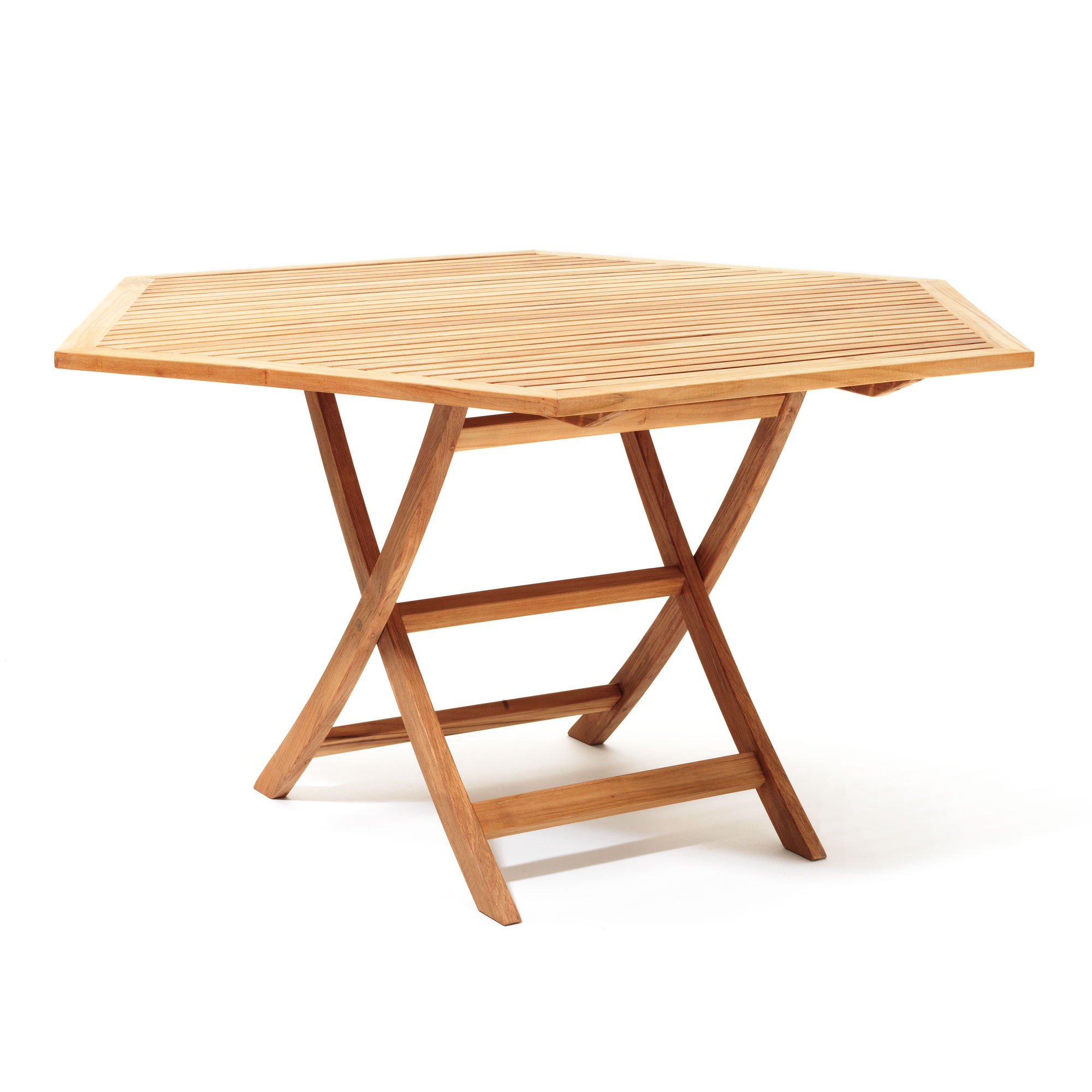 Viken, bord i massiv teak från Skargaarden. När Gunilla Norin formgav den fällbara stolen 1983 var den unik tack vare det faktum att den saknade metalldelar. Sedan dess har Vikenstolen blivit en av världens mest plagierade möbelmodeller, men det finns bara ett original. När bordet formgavs var ambitionen att även det skulle tillverkas utan metalldelar, men det visade sig att det behövdes några skruvar för att fästa bordsskivan i benställningen. Av teak, lim och yrkesskicklighet (och några skruvar) tillverkas bordet Viken i två storlekar; 110 cm eller 140 cm mätt från hörn till hörn på den sexkantiga skivan.