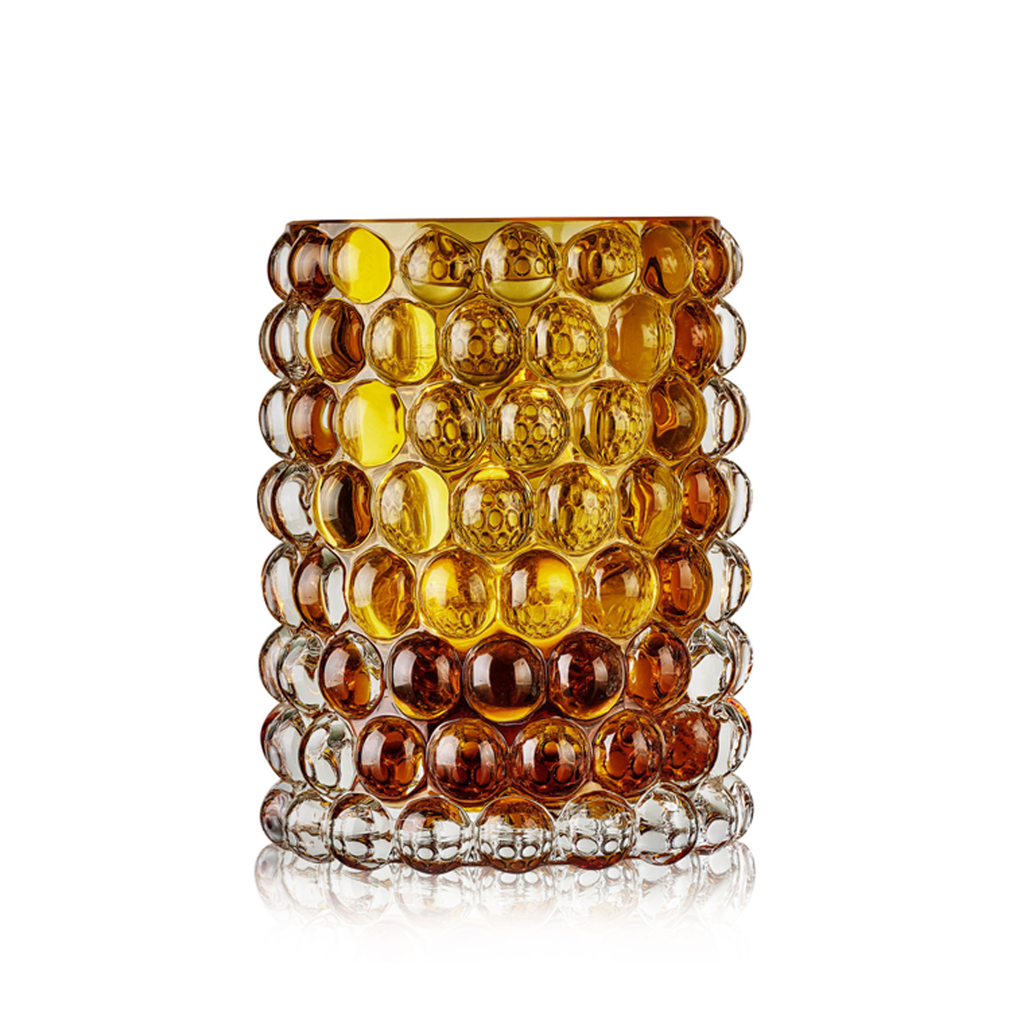 Den handblåsta ljuslyktan Hurricane Lamp Boule Large Amber från Skogsberg & Smart utmärker sig med sin bubbliga textur på glasytan. Denna design ger ett glittrande ljus som påminner om glaskonst från 70-talet. Lyktans generösa dimensioner tillåter den även att användas som en elegant vas för blomsterarrangemang. Varje exemplar är skapat för hand och är därmed unikt, med möjliga variationer på upp till +/- 3% som en naturlig del av dess charm.Med ett urval av olika färgalternativ kan Boule-serien bidra med en spännande touch till vilken inredning som helst. Bubblorna bildas under en process där glaset blåses in i en gjutjärnsform och sedan formas manuellt. Detta ger varje ljuslykta ett distinkt mönster och en känsla av exklusivitet. Dessa munblåsta skapelser kommer från Böhmen i Tjeckien, där traditionellt hantverk fortfarande värderas högt.