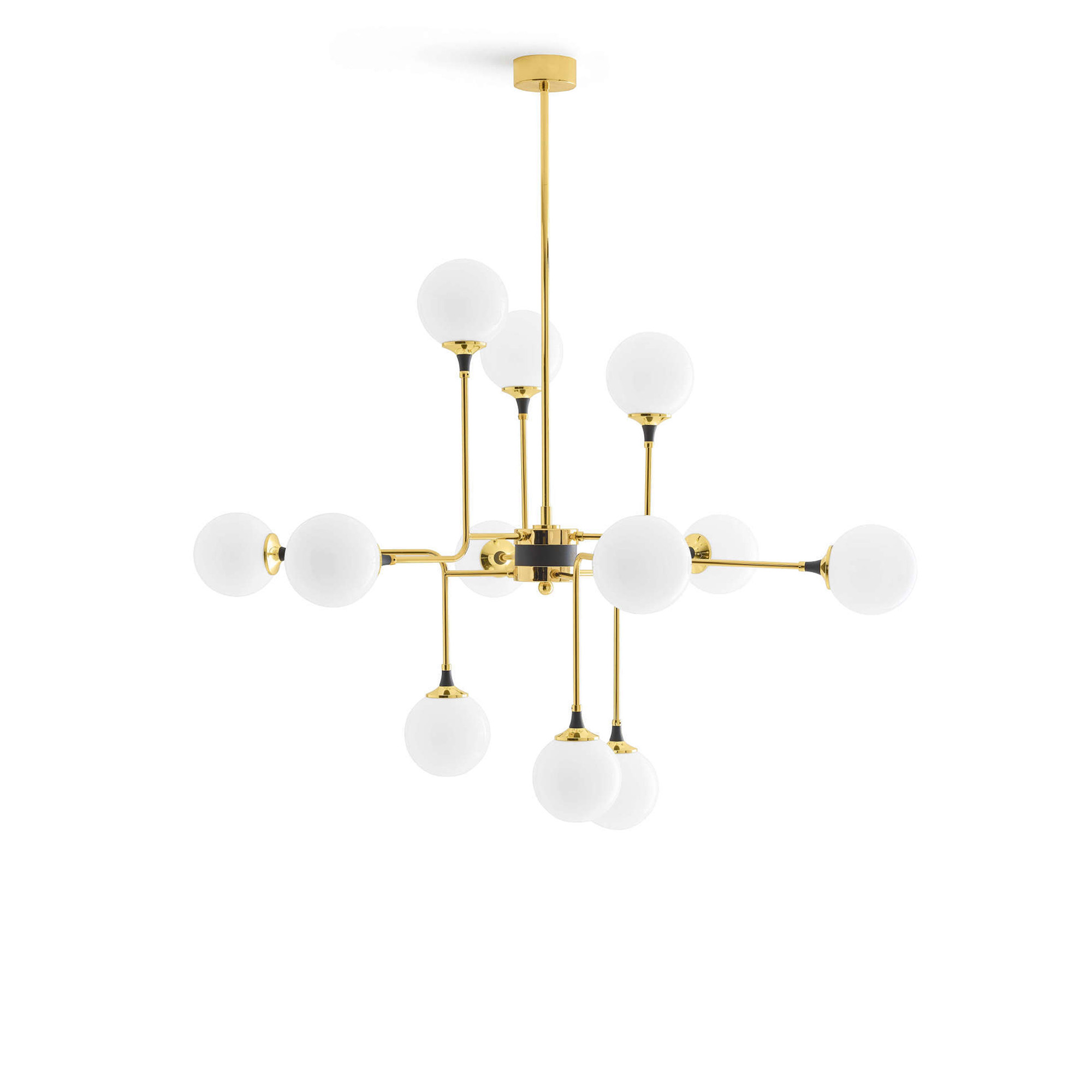 Galassia Suspension Gold/White från det italienska varumärket Stilnovo. Galassia takkrona har den perfekta kombinationen av elegans och retrostil. Med sin 1950-tals charm, är denna taklampa tillverkad i en mässingsstruktur med galvanisk förgyllning och vita triplex blåsta glaskulor. Galassia är en taklampa som kommer att dra till sig uppmärksamhet i vilket rum som helst. En inredningsdetalj tillverkad av högkvalitativa material och utformad i en tidlös design som gör att den kommer att hålla i generationer.