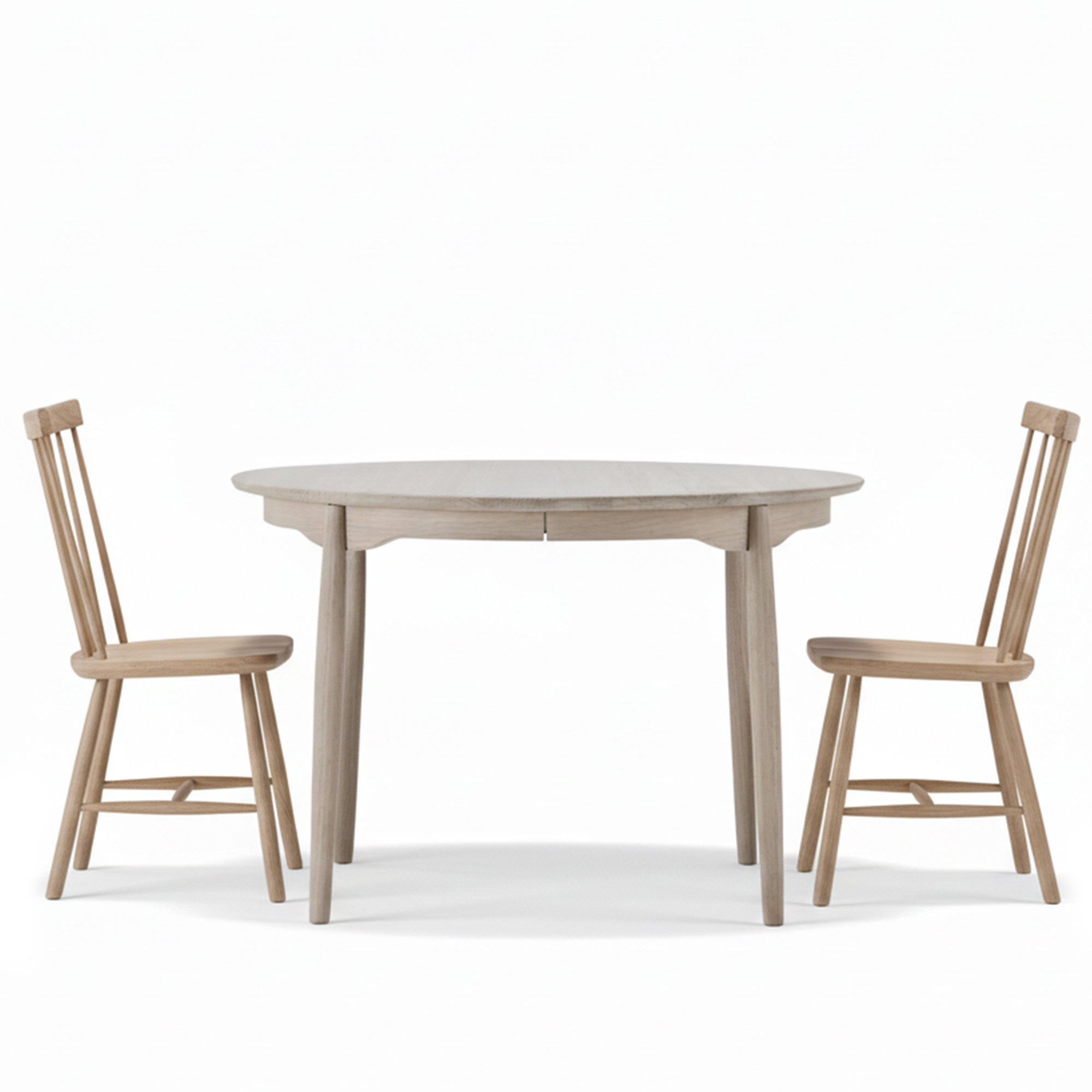 Välj mellan ett Carl matbord Ø115 cm med två Lilla Åland stolar, eller ett Carl matbord Ø115 cm med två iläggsskivor och sex Lilla Åland stolar – båda matgrupper i vitoljad ek.