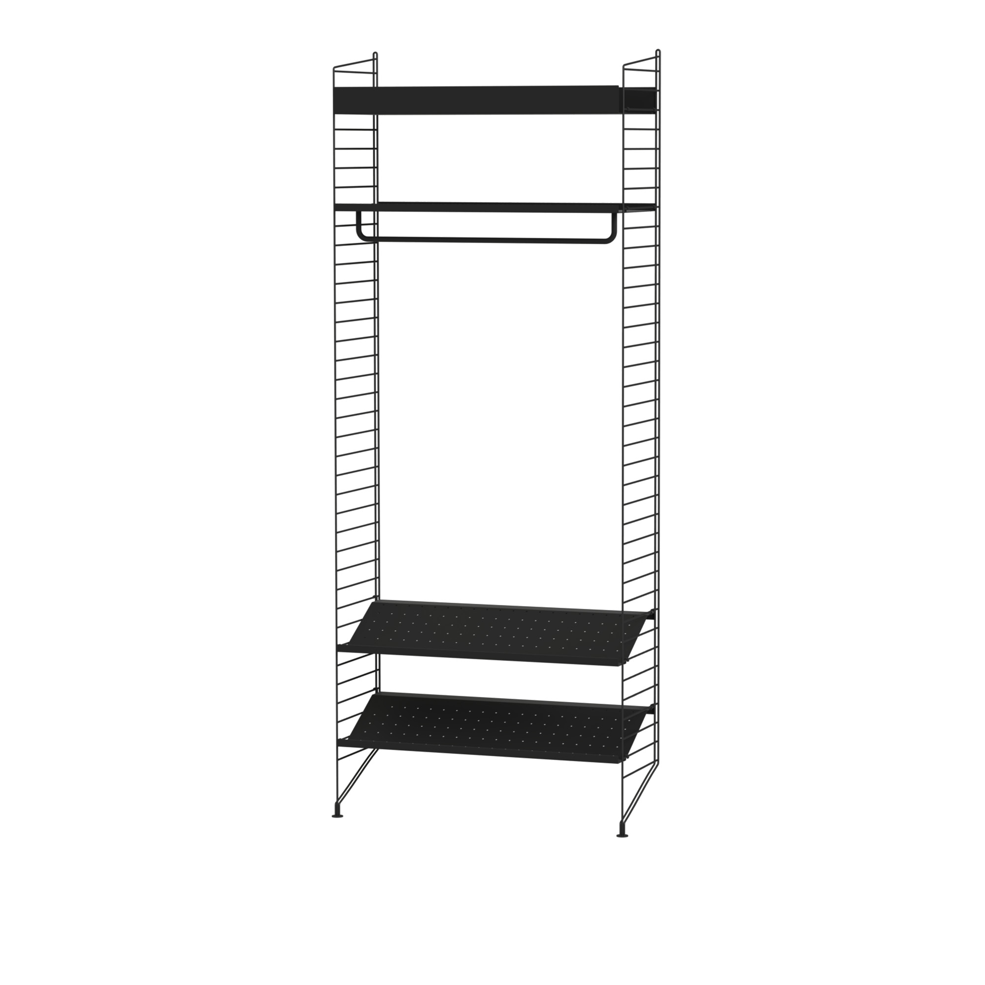 Hall Hyllsystem L är ett väggmonterat hyllsystem med fötter från det svenska varumärket String. Stringhyllan är en sann designklassiker, som under årtionden har etablerats som ett tidlöst, sofistikerat och ändlöst hyllsystem som kan anpassas efter behov och utrymme. Hall Hyllsystem L består av skohyllor, hyllplan och klädstång för generös förvaring som inte tar för mycket av rummet i anspråk. Dess flexibla design gör det möjligt att systemet kan byggas ut och förändras över tid. Vid specifika behov och önskemål erbjuder planeringsverktyget String Planner, som finns tillgängligt på vår hemsida, oändliga förvaringslösningar för privata hem såväl som offentliga miljöer.