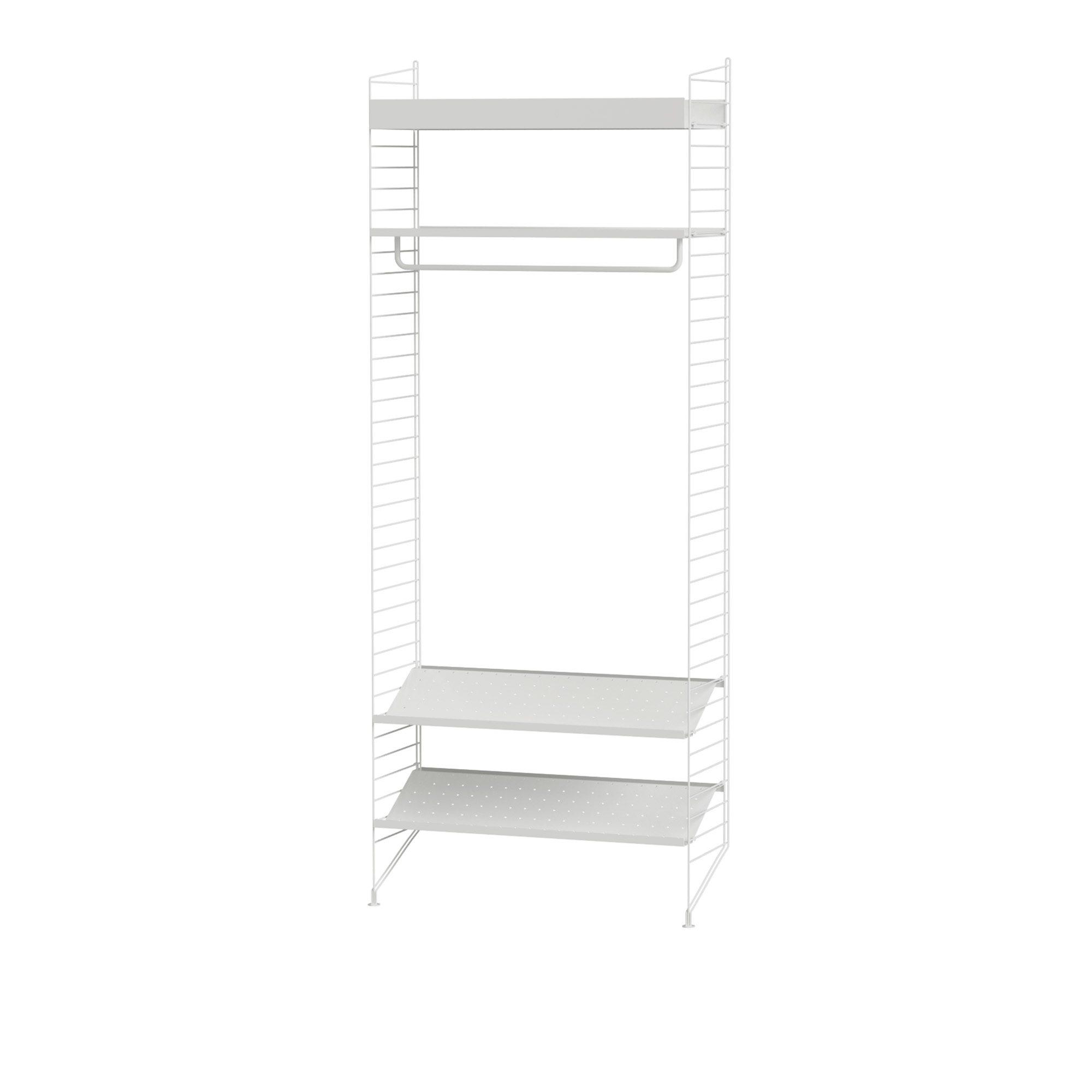 Hall Hyllsystem L är ett väggmonterat hyllsystem med fötter från det svenska varumärket String. Stringhyllan är en sann designklassiker, som under årtionden har etablerats som ett tidlöst, sofistikerat och ändlöst hyllsystem som kan anpassas efter behov och utrymme. Hall Hyllsystem L består av skohyllor, hyllplan och klädstång för generös förvaring som inte tar för mycket av rummet i anspråk. Dess flexibla design gör det möjligt att systemet kan byggas ut och förändras över tid. Vid specifika behov och önskemål erbjuder planeringsverktyget String Planner, som finns tillgängligt på vår hemsida, oändliga förvaringslösningar för privata hem såväl som offentliga miljöer.