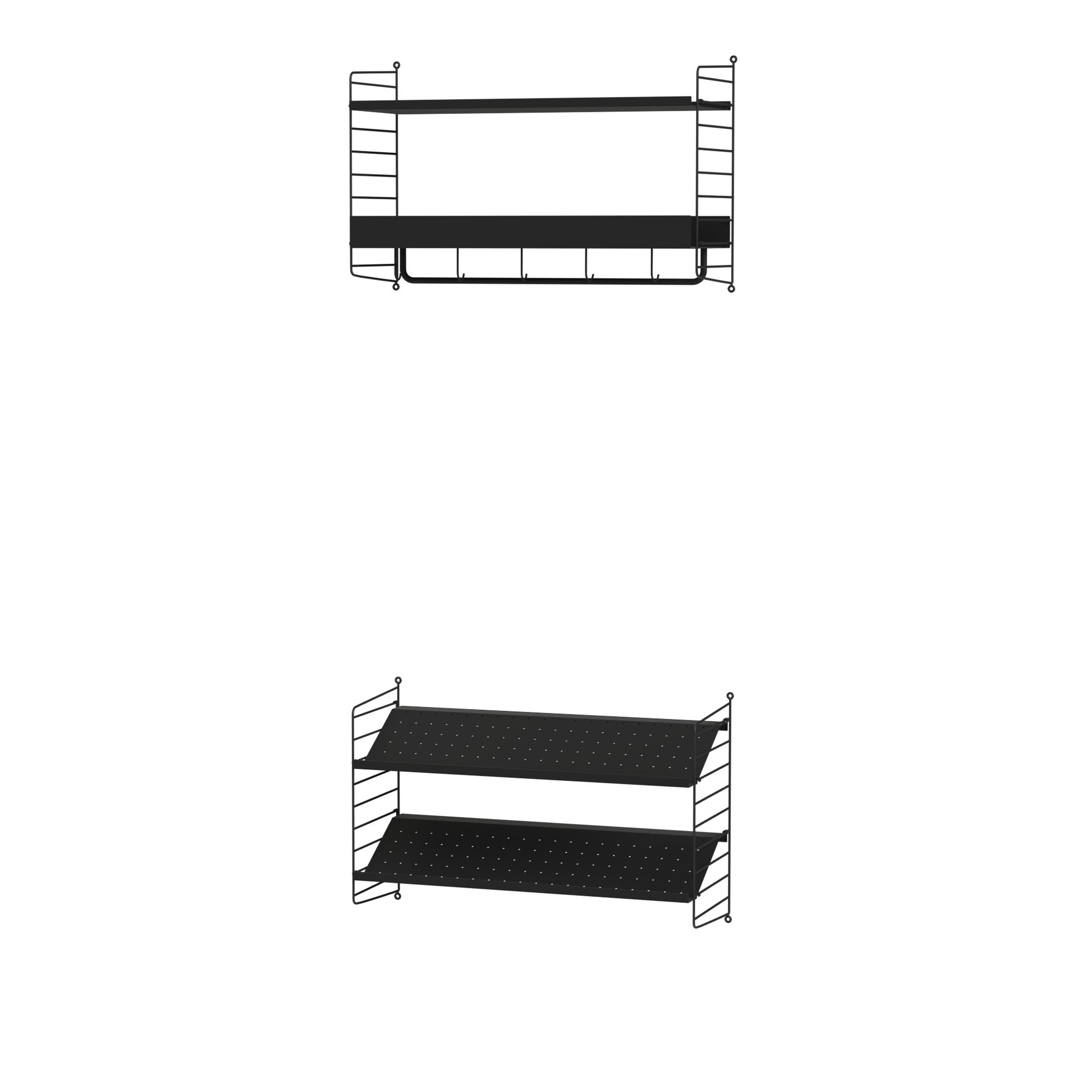 Hall Hyllsystem Q är ett vägghängt hyllsystem i två sektioner från String. Hyllsystemet består av skohylla, klädstång och hyllplan och erbjuder sofistikerad och tidlös förvaring som är väl genomtänkt och högst funktionell. Dess flexibla design gör det möjligt att systemet kan byggas ut och förändras över tid. Vid specifika behov och önskemål erbjuder planeringsverktyget String Planner, som finns tillgängligt på vår hemsida, oändliga förvaringslösningar för privata hem såväl som offentliga miljöer.