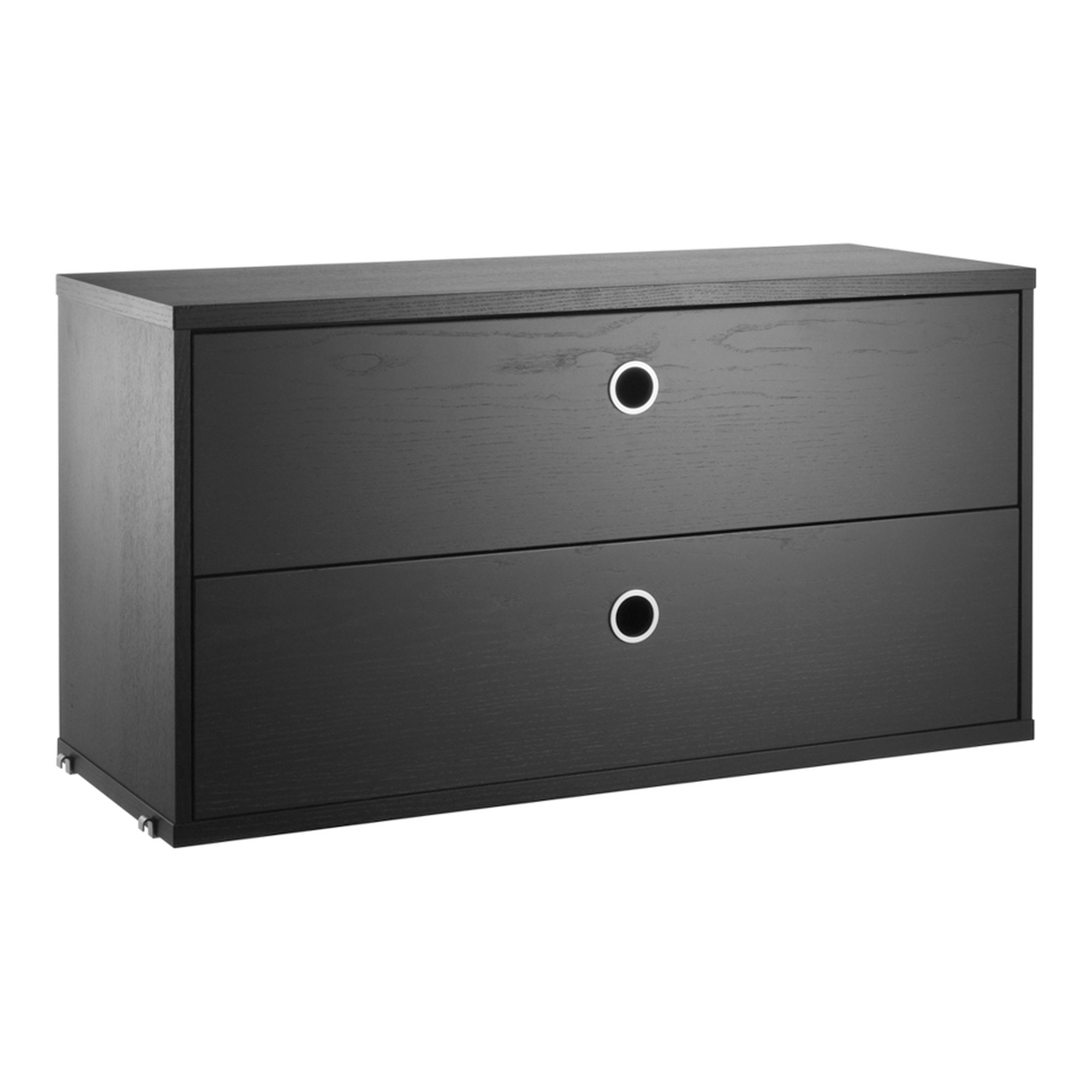 Lådhurtsen passar med samtliga tråd- och plexgavlar från String System förutsatt att gavlarna har 30 cm djup. Den är designad med två utdragbara lådor vilket gör de optimala för dold förvaring. Den passar såväl i hallen som i vardagsrummet eller barnrummet. Lådhurtsen levereras omonterad.