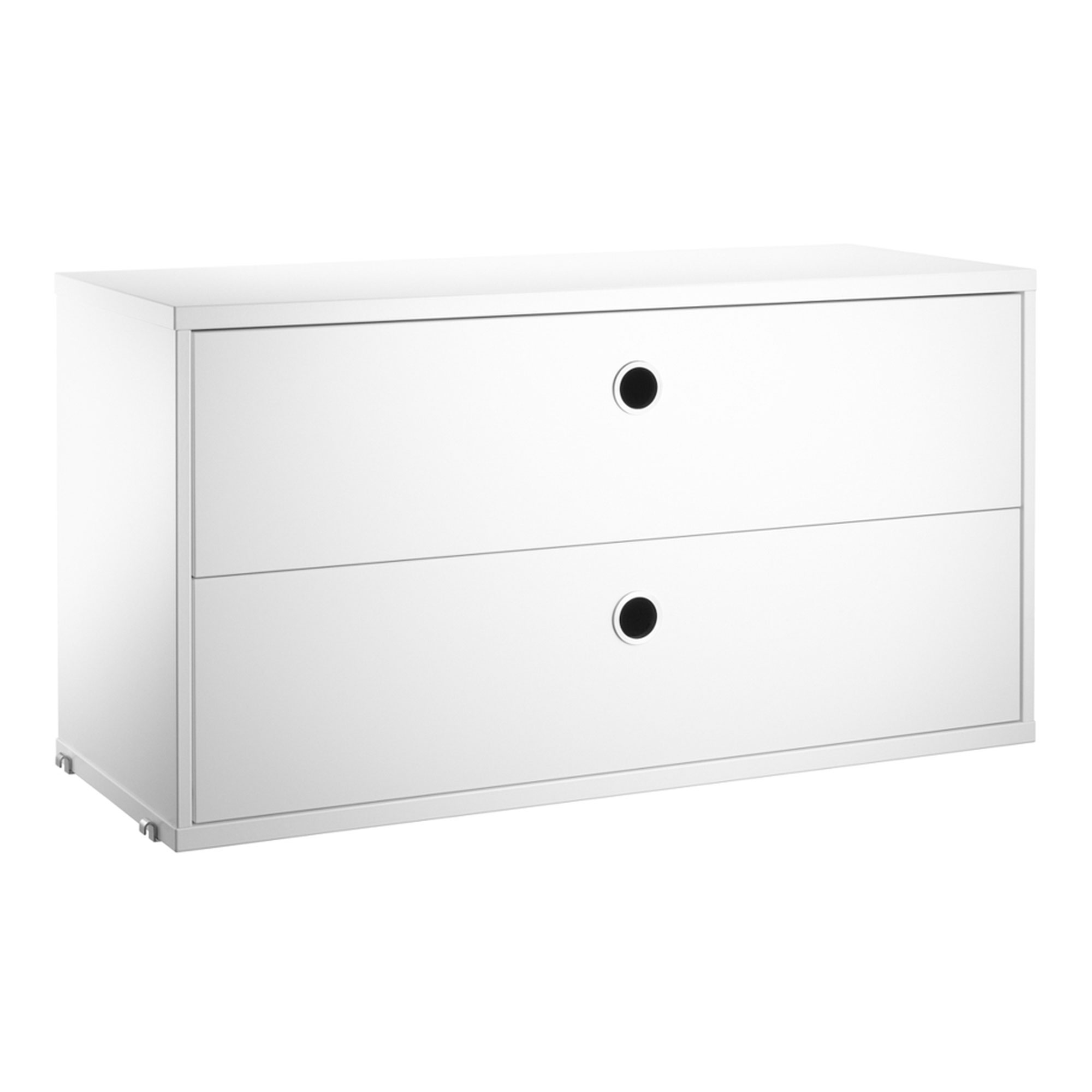 Lådhurtsen passar med samtliga tråd- och plexgavlar från String System förutsatt att gavlarna har 30 cm djup. Den är designad med två utdragbara lådor vilket gör de optimala för dold förvaring. Den passar såväl i hallen som i vardagsrummet eller barnrummet. Lådhurtsen levereras omonterad.