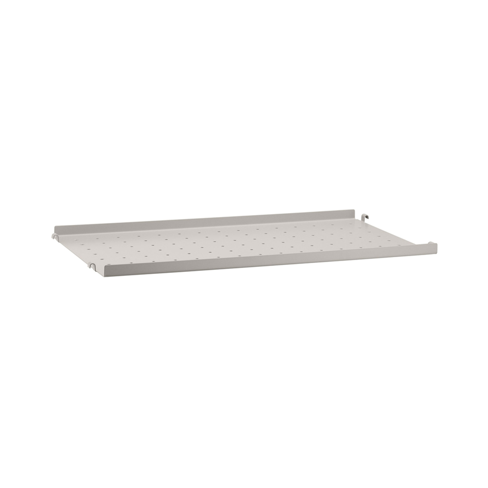 String metallhyllplan är ett hyllplan från svenska String. Det ingår i det flexibla String System, formgivet av Nisse Strinning 1949, och kan kombineras fritt med systemets övriga delar. Hyllplanet är tillverkat i perforerad metall och har en låg kant på 2 cm, vilket gör att det integreras visuellt med trähyllplan i samma uppsättning. Det finns i bredderna 58 cm och 78 cm samt djupen 20 cm och 30 cm. Monteringen sker i tråd- eller plexgavlar med motsvarande djup, och hyllplanet kan enkelt flyttas vid behov. Den perforerade ytan gör det möjligt att addera tillbehör som krokar, stänger eller spjut för att anpassa förvaringen. Det kan användas i kök, hall eller arbetsplats där både öppen struktur och funktion är viktig. Varje förpackning innehåller ett hyllplan.