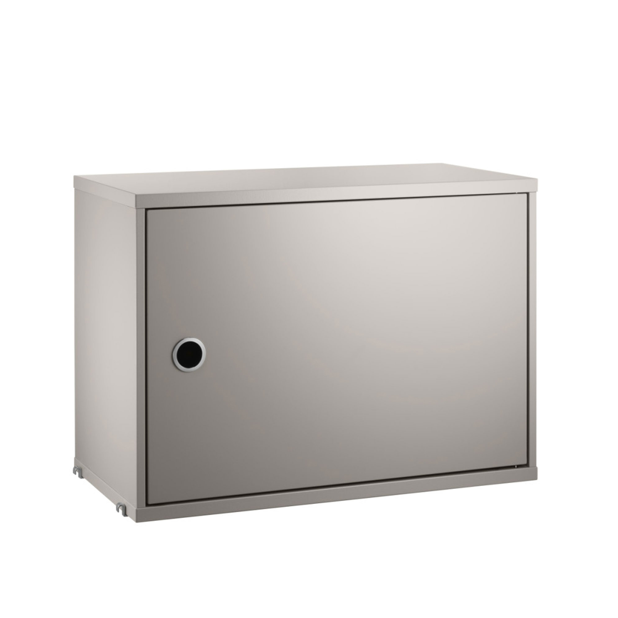 Detta är ett förvaringsskåp från String. Skåpet är utvecklat för att användas tillsammans med tråd- och plexgavlar med 30 cm djup och integreras direkt i befintliga String-hyllor. Genom att tillföra ett skåp till hyllsystemet skapas en tydlig variation mellan öppen och stängd förvaring, samtidigt som ovansidan fungerar som en praktisk avställningsyta.