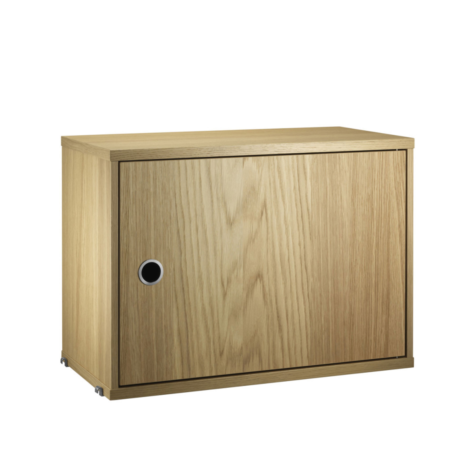 Detta är ett förvaringsskåp från String. Skåpet är utvecklat för att användas tillsammans med tråd- och plexgavlar med 30 cm djup och integreras direkt i befintliga String-hyllor. Genom att tillföra ett skåp till hyllsystemet skapas en tydlig variation mellan öppen och stängd förvaring, samtidigt som ovansidan fungerar som en praktisk avställningsyta.
