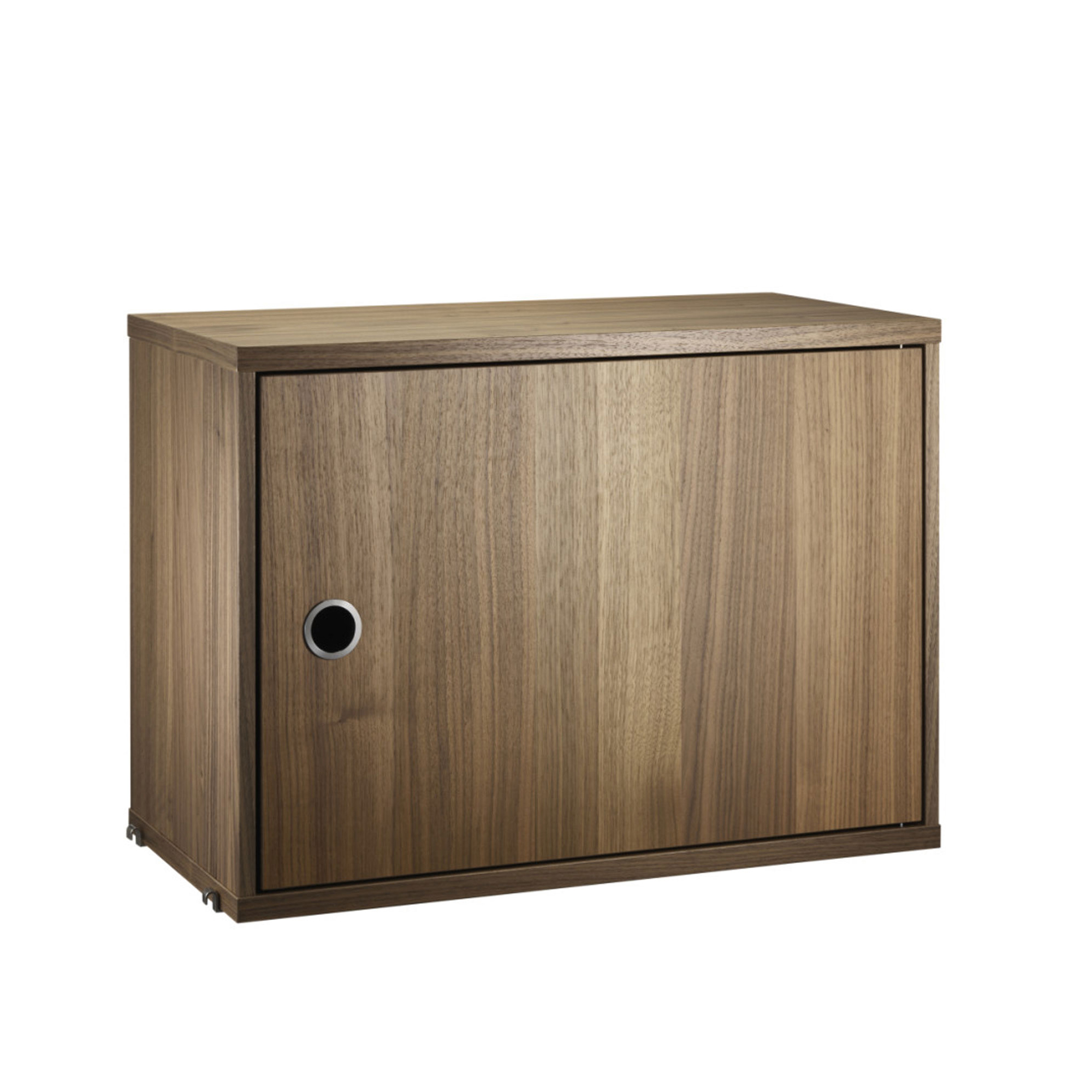 Detta är ett förvaringsskåp från String. Skåpet är utvecklat för att användas tillsammans med tråd- och plexgavlar med 30 cm djup och integreras direkt i befintliga String-hyllor. Genom att tillföra ett skåp till hyllsystemet skapas en tydlig variation mellan öppen och stängd förvaring, samtidigt som ovansidan fungerar som en praktisk avställningsyta.