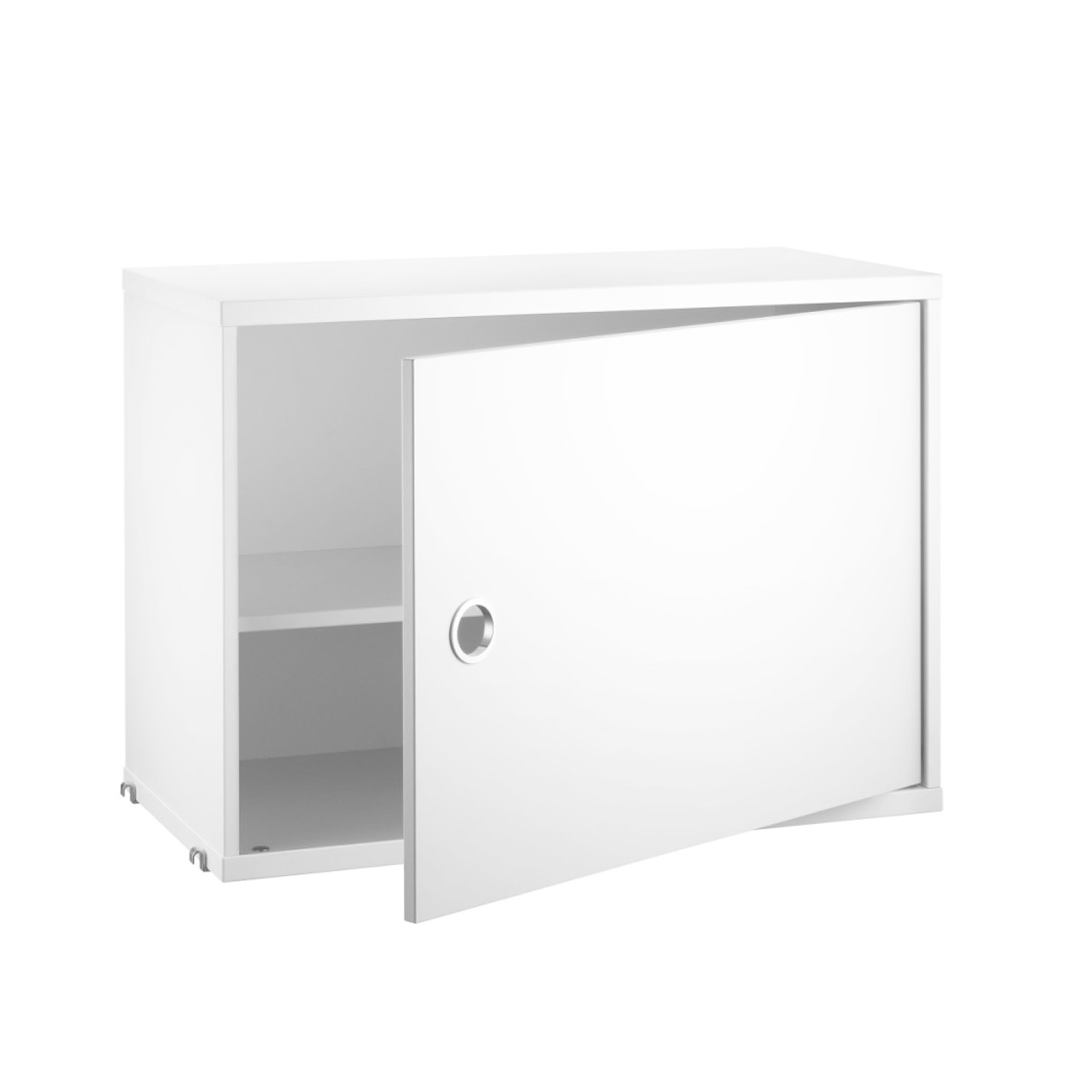 Detta är ett förvaringsskåp från String. Skåpet är utvecklat för att användas tillsammans med tråd- och plexgavlar med 30 cm djup och integreras direkt i befintliga String-hyllor. Genom att tillföra ett skåp till hyllsystemet skapas en tydlig variation mellan öppen och stängd förvaring, samtidigt som ovansidan fungerar som en praktisk avställningsyta.