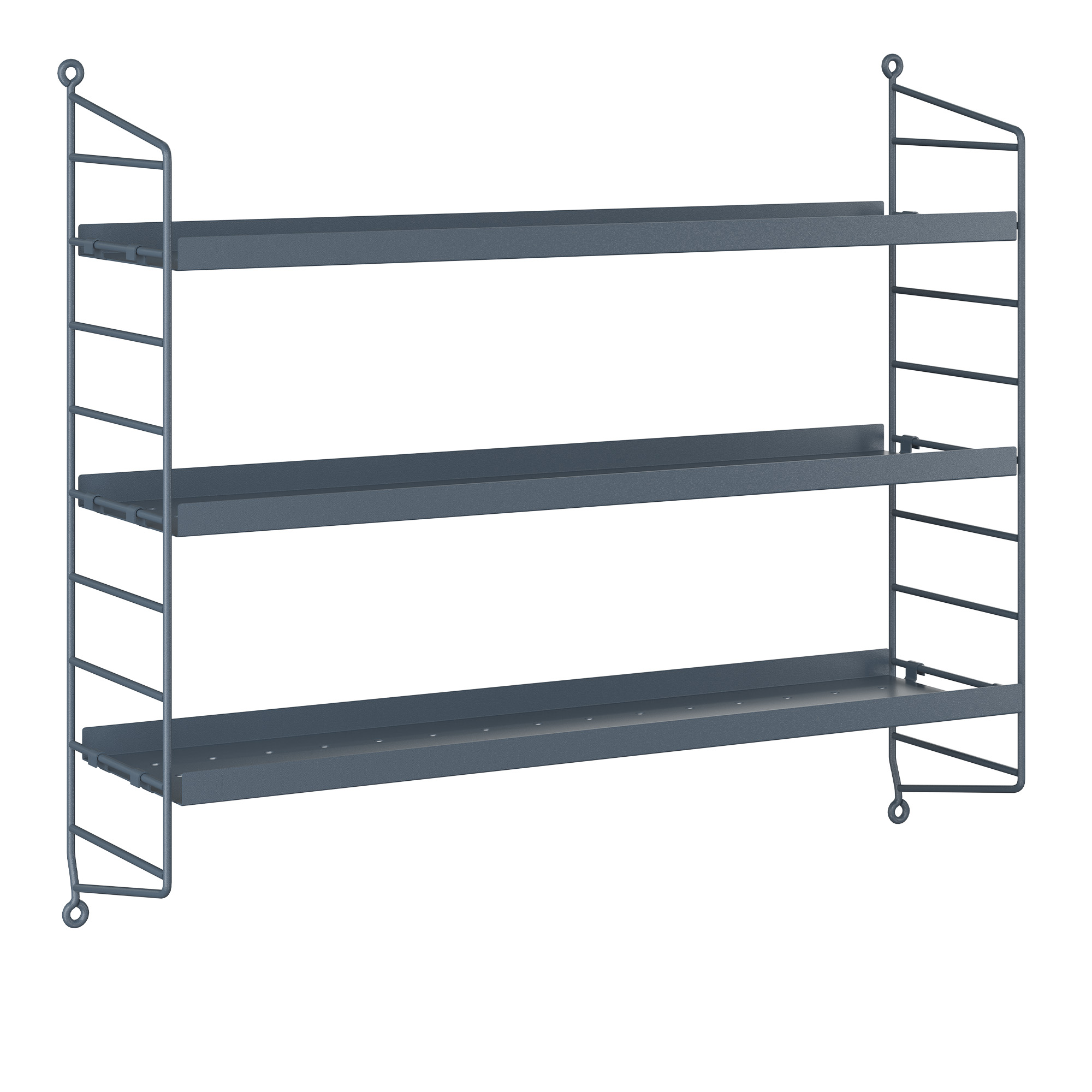 String Pocket är en vägghylla från det svenska varumärket String. Hyllan designades av Nisse Strinning som en kompakt variant av det större String System, men med samma flexibilitet och möjlighet till personlig anpassning. Denna version består av två trådgavlar med höjd 50 cm och tre perforerade metallhyllplan med bredd 58 cm och djup 15 cm. Hyllplanen har en låg kant på 2 cm, vilket gör det möjligt att komplettera med krokar och stänger i 30 eller 58 cm för utökad funktion. String Pocket säljs som ett komplett paket och kan användas fristående eller kombineras med flera enheter i rad eller på höjden. Den kompakta formen gör den lämplig för mindre utrymmen som hall, kök eller arbetsplats. Flera färger finns tillgängliga för att skapa kontrast eller ett enhetligt uttryck i inredningen.