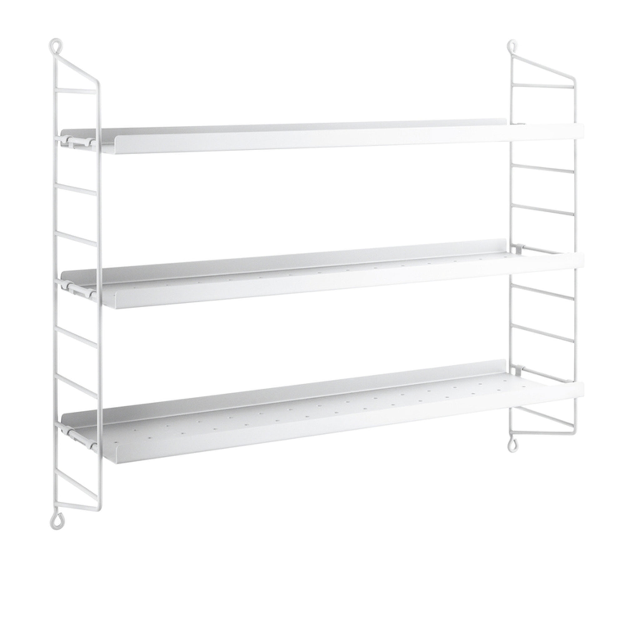String Pocket är en vägghylla från det svenska varumärket String. Hyllan designades av Nisse Strinning som en kompakt variant av det större String System, men med samma flexibilitet och möjlighet till personlig anpassning. Denna version består av två trådgavlar med höjd 50 cm och tre perforerade metallhyllplan med bredd 58 cm och djup 15 cm. Hyllplanen har en låg kant på 2 cm, vilket gör det möjligt att komplettera med krokar och stänger i 30 eller 58 cm för utökad funktion. String Pocket säljs som ett komplett paket och kan användas fristående eller kombineras med flera enheter i rad eller på höjden. Den kompakta formen gör den lämplig för mindre utrymmen som hall, kök eller arbetsplats. Flera färger finns tillgängliga för att skapa kontrast eller ett enhetligt uttryck i inredningen.