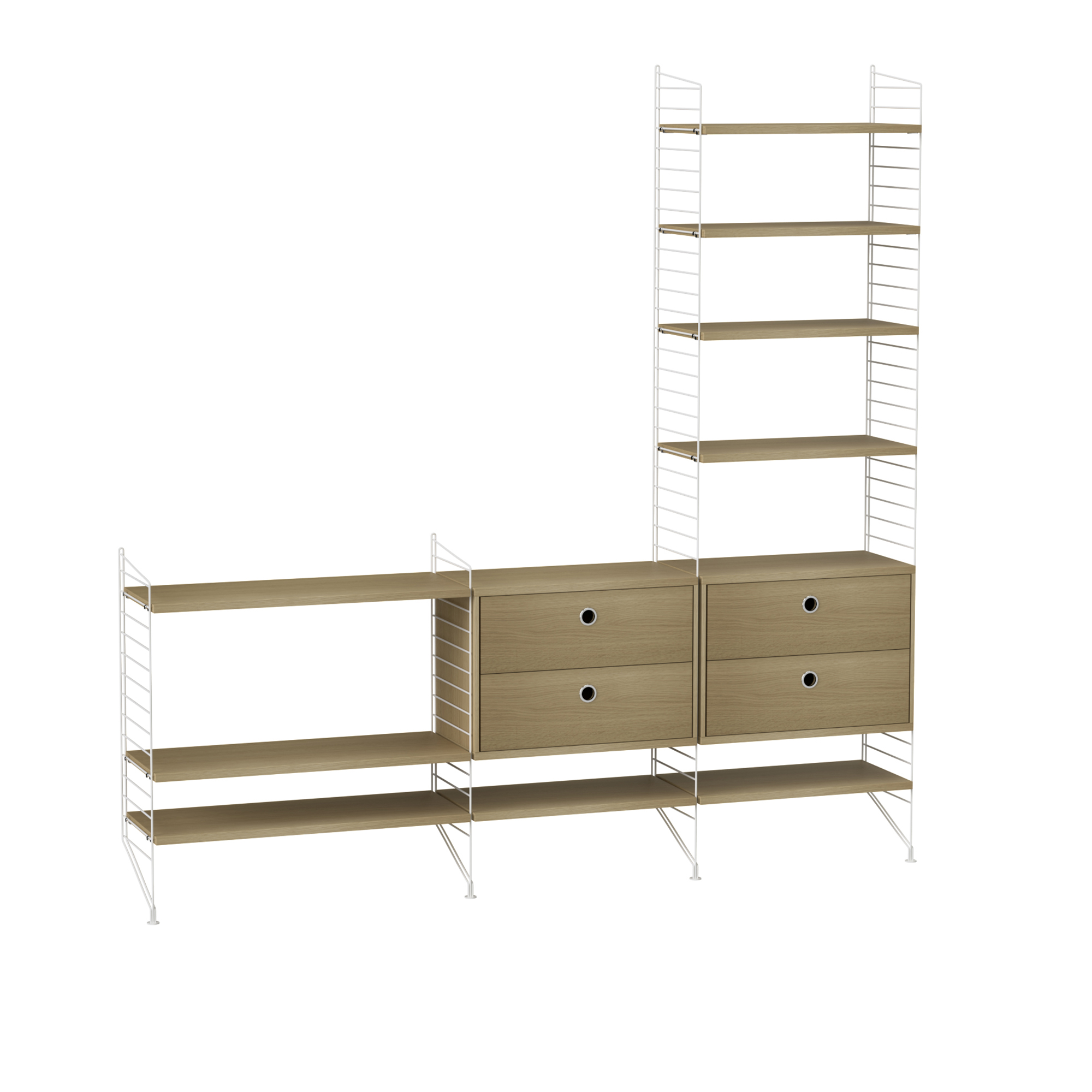 String Vardagsrum J är en smart och flexibel hylllösning från String Furniture. Denna kombination består av 4 golvgavlar, 9 hyllplan och 2 lådhurtsar, vilket ger gott om utrymme för förvaring. Vi erbjuder ett brett urval av färgkombinationer, material och träslag så att du kan anpassa din String Vardagsrum J efter din smak och stil. Med sitt stilrena och tidlösa design passar den perfekt i olika hemmiljöer och garanterar långvarig användning.