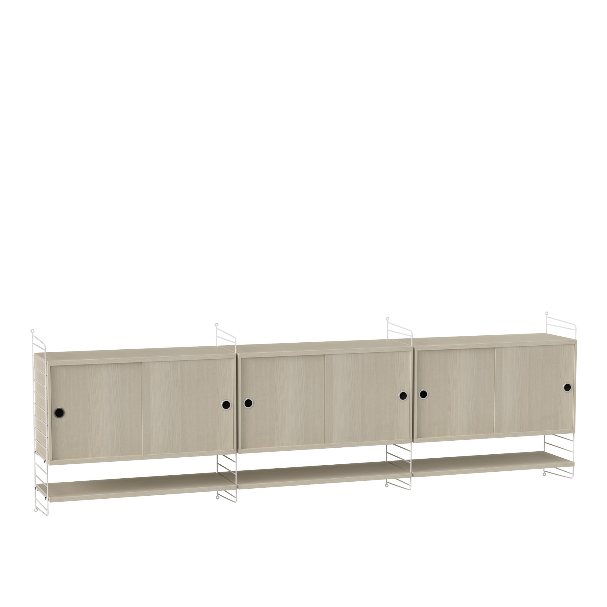 Vardagsrum Hyllsystem E är en väggmonterad skänk med hyllplan från svenska String. Hyllsystemet, som har skåp med skjutdörrar och hyllplan undertill, följer det ikoniska och tidlösa formspråk som genomsyrar String, där hög funktion möter stilren formgivning och ändlösa konfigurationsmöjligheter.