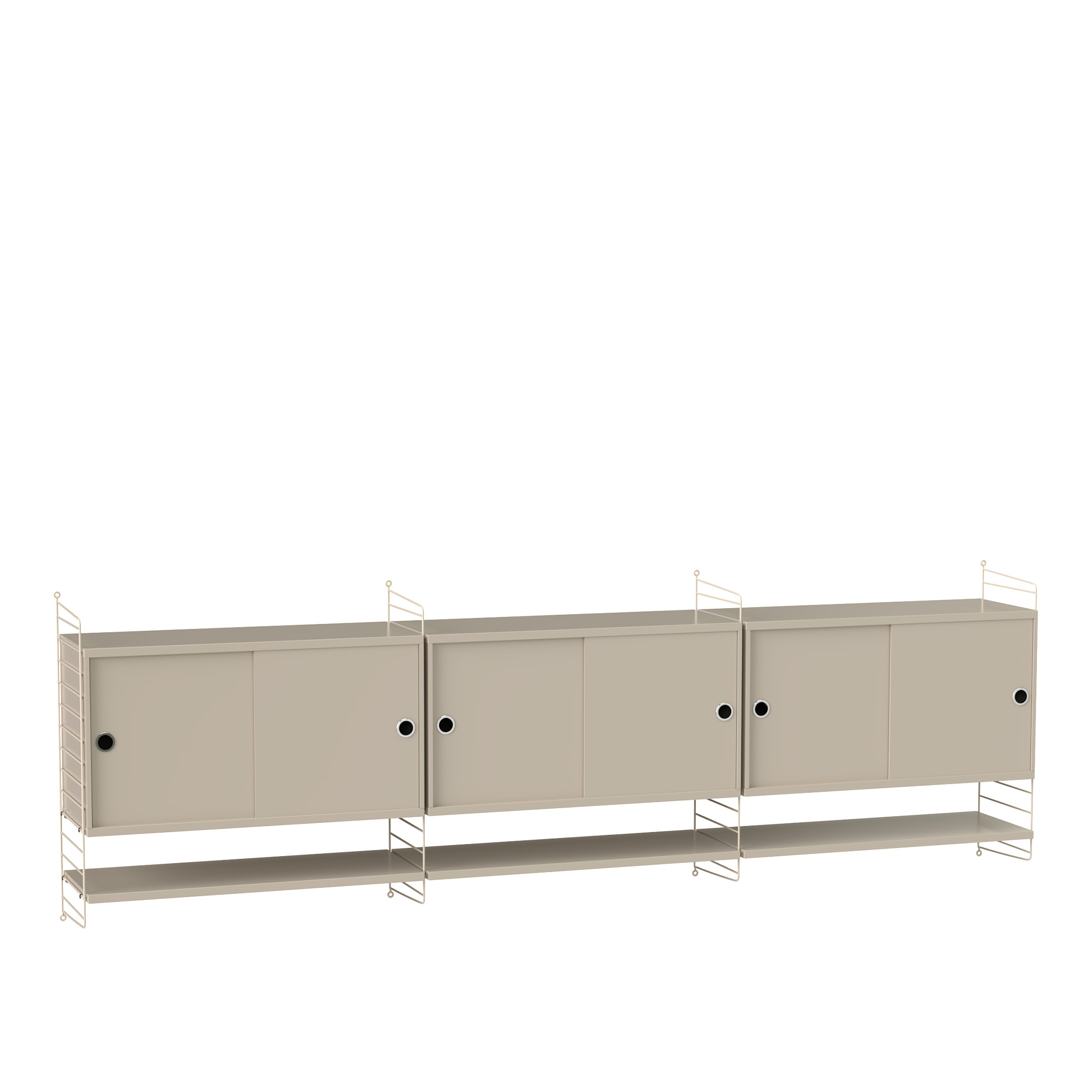 Vardagsrum Hyllsystem E är en väggmonterad skänk med hyllplan från svenska String. Hyllsystemet, som har skåp med skjutdörrar och hyllplan undertill, följer det ikoniska och tidlösa formspråk som genomsyrar String, där hög funktion möter stilren formgivning och ändlösa konfigurationsmöjligheter.