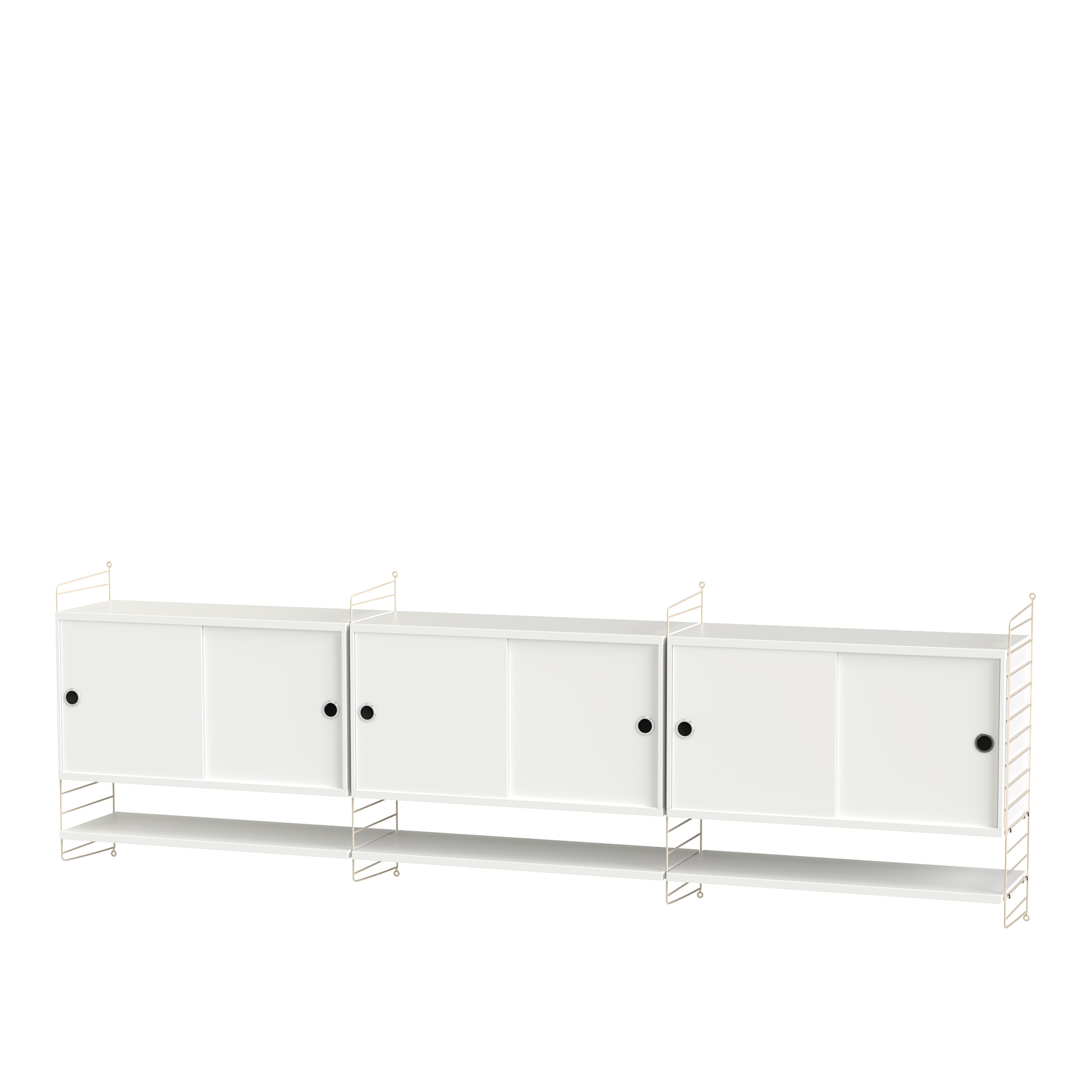 Vardagsrum Hyllsystem E är en väggmonterad skänk med hyllplan från svenska String. Hyllsystemet, som har skåp med skjutdörrar och hyllplan undertill, följer det ikoniska och tidlösa formspråk som genomsyrar String, där hög funktion möter stilren formgivning och ändlösa konfigurationsmöjligheter.