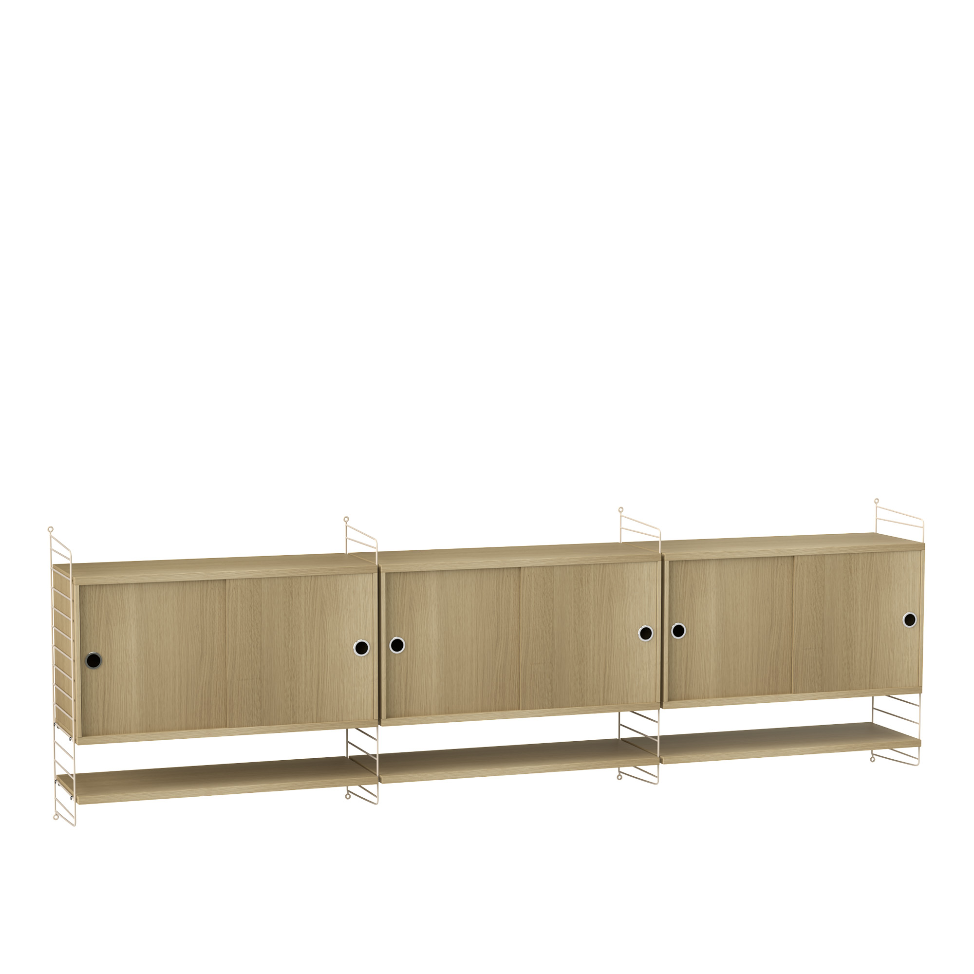 Vardagsrum Hyllsystem F är ett väggmonterad hyllsystem med fotstöd från svenska String. Hyllsystem F består av tre skåp med skjutdörrar och hyllplan undertill, och erbjuder generös förvaring och enkel organisering av böcker och föremål i vardagsrummet. Dess modulära design gör det möjligt att sömlöst bygga ut hyllsystemet med nya moduler och sektioner över tid. Finns tillgänglig i en rad olika utföranden.