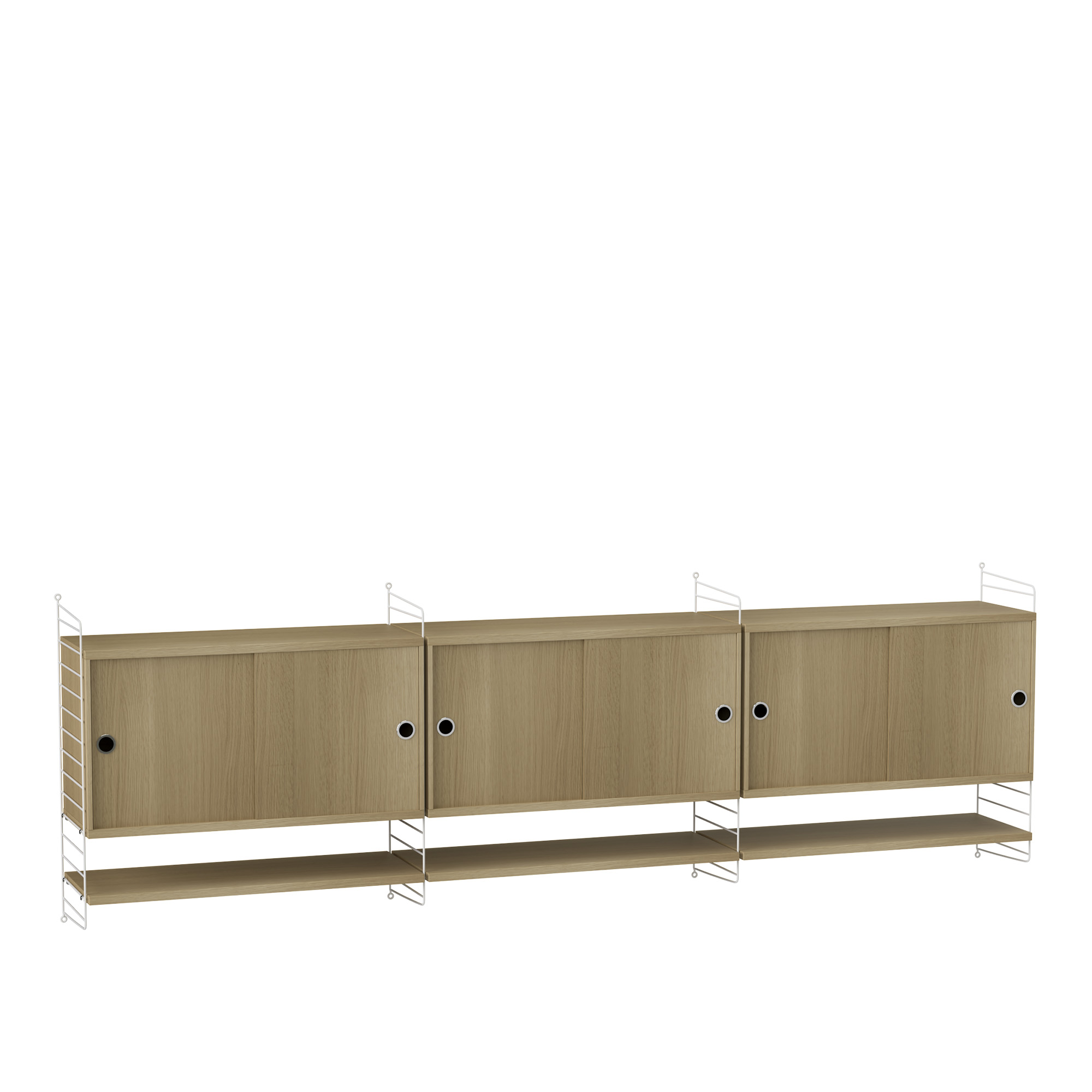 Vardagsrum Hyllsystem F är ett väggmonterad hyllsystem med fotstöd från svenska String. Hyllsystem F består av tre skåp med skjutdörrar och hyllplan undertill, och erbjuder generös förvaring och enkel organisering av böcker och föremål i vardagsrummet. Dess modulära design gör det möjligt att sömlöst bygga ut hyllsystemet med nya moduler och sektioner över tid. Finns tillgänglig i en rad olika utföranden.