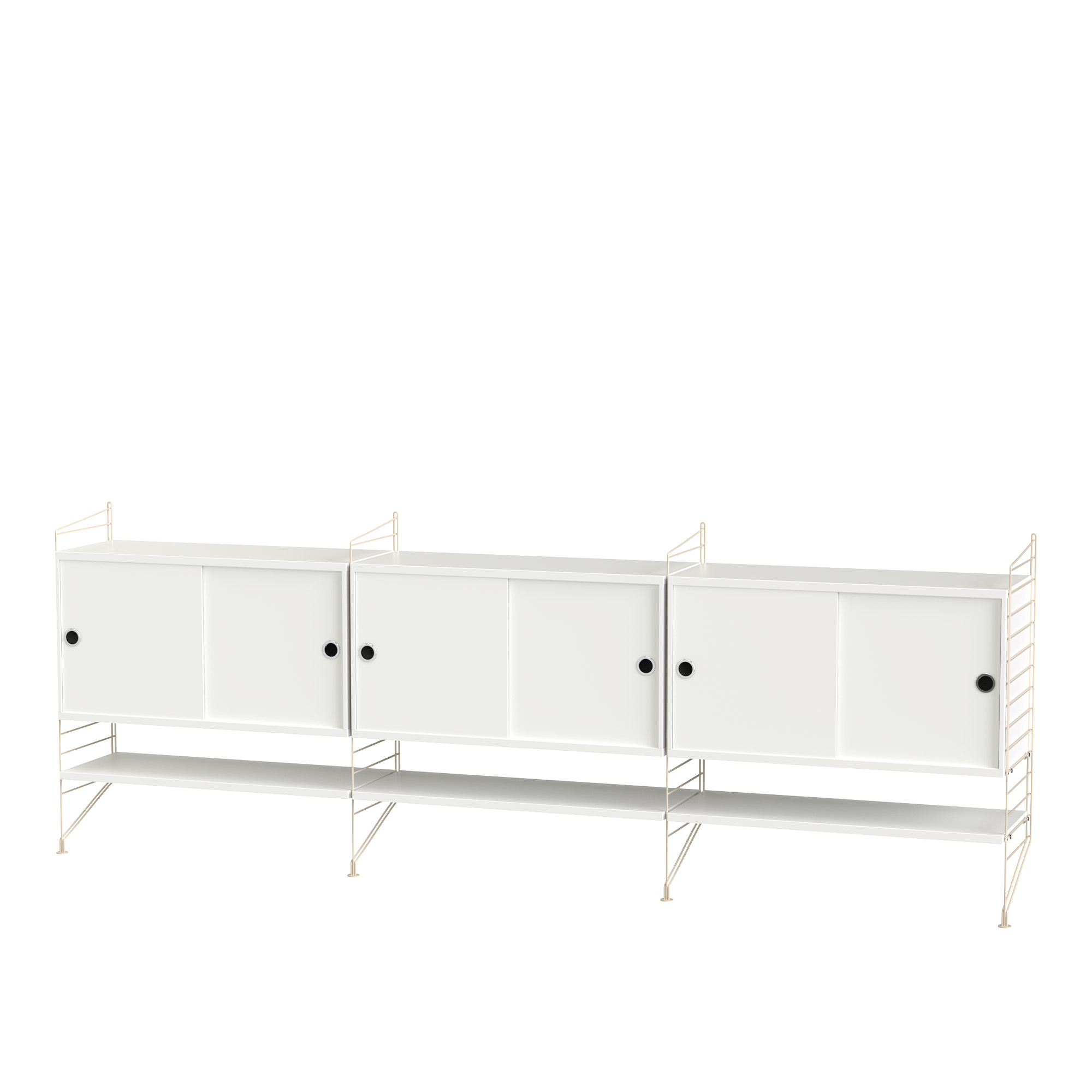 Vardagsrum Hyllsystem F är ett väggmonterad hyllsystem med fotstöd från svenska String. Hyllsystem F består av tre skåp med skjutdörrar och hyllplan undertill, och erbjuder generös förvaring och enkel organisering av böcker och föremål i vardagsrummet. Dess modulära design gör det möjligt att sömlöst bygga ut hyllsystemet med nya moduler och sektioner över tid. Finns tillgänglig i en rad olika utföranden.