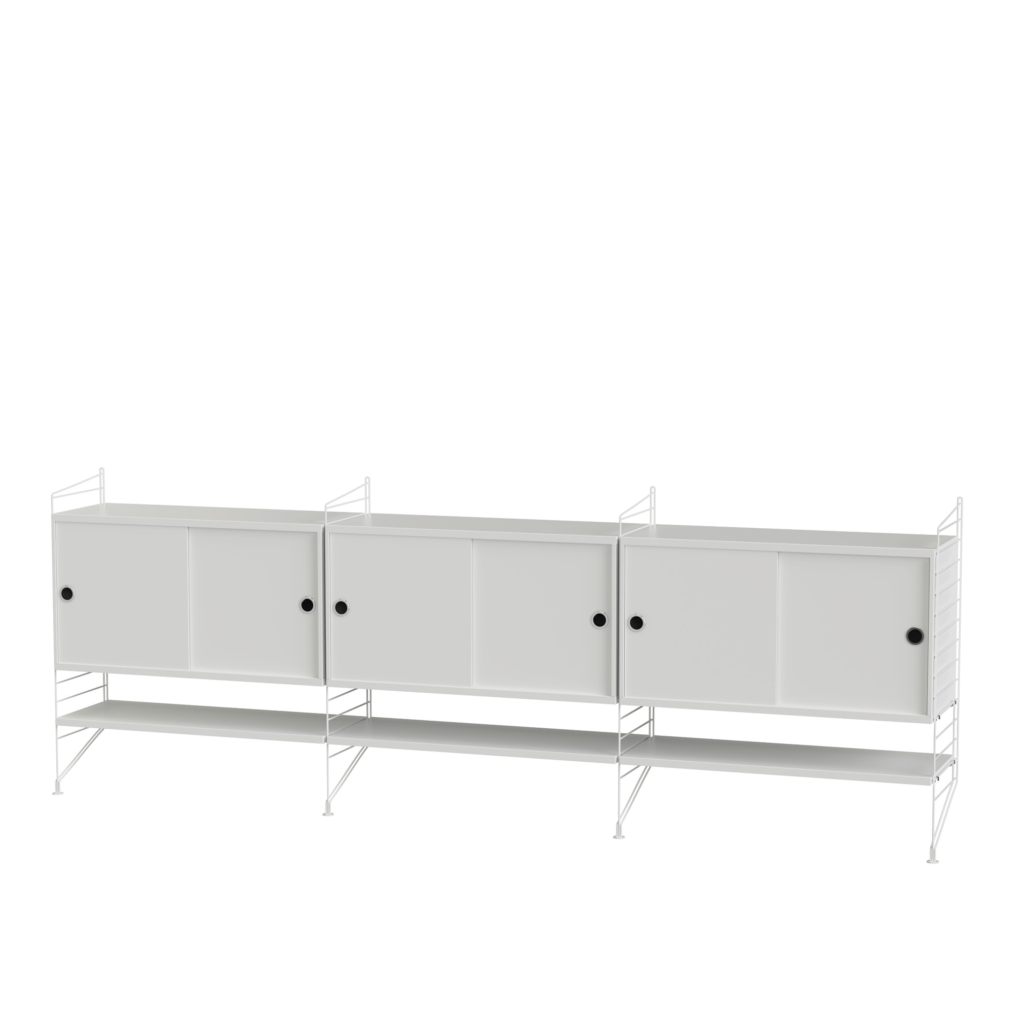 Vardagsrum Hyllsystem F är ett väggmonterad hyllsystem med fotstöd från svenska String. Hyllsystem F består av tre skåp med skjutdörrar och hyllplan undertill, och erbjuder generös förvaring och enkel organisering av böcker och föremål i vardagsrummet. Dess modulära design gör det möjligt att sömlöst bygga ut hyllsystemet med nya moduler och sektioner över tid. Finns tillgänglig i en rad olika utföranden.