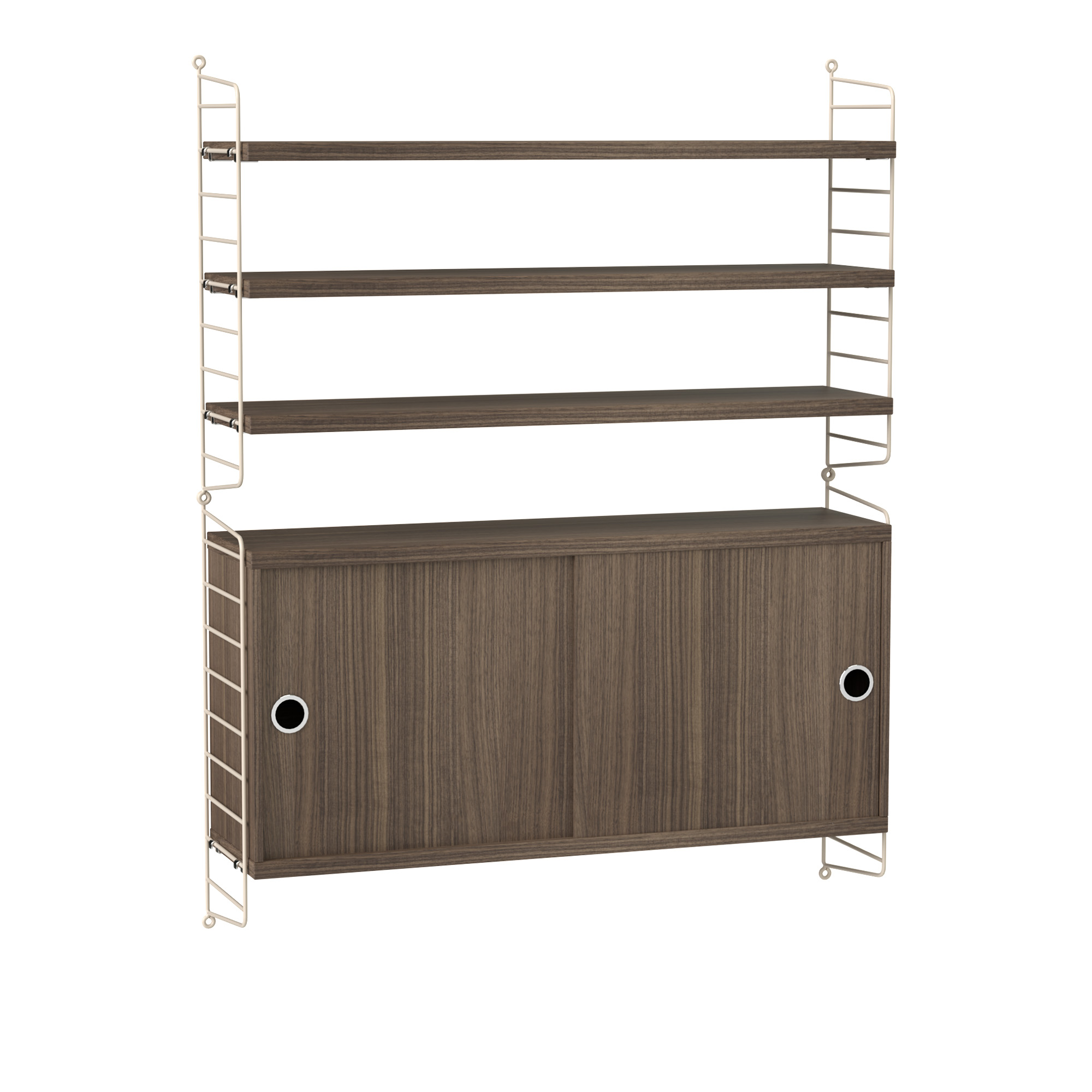 Vardagsrum Hyllsystem I från svenska String är ett mindre hyllsystem speciellt framtaget för användning i vardagsrummet, som solitär eller i kombination med andra moduler och sektioner. Hyllsystem I erbjuder generös väggförvaring bestående av skåp med skjutdörrar och flera hyllplan för stilren förvaring av böcker, prydnadsföremål och småsaker. Finns tillgänglig i flera valbara utföranden.