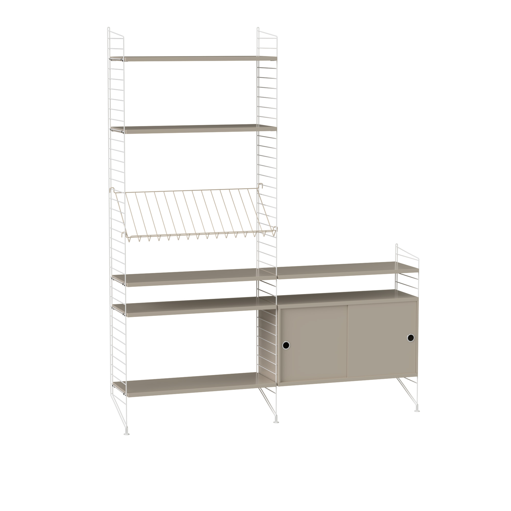 Vardagsrum Hyllsystem K från String erbjuder generösa förvaringsmöjligheter och flexibilitet. Hyllsystem K består av hyllor, tidningsställ och skåp med skjutdörrar, och är speciellt konfigurerat för att användning i vardagsrummet. Dess modulära design gör det möjligt att efter behov bygga ut och lägga till moduler, sektioner och tillbehör från Strings övriga sortiment. Finns tillgänglig i flera utföranden.
