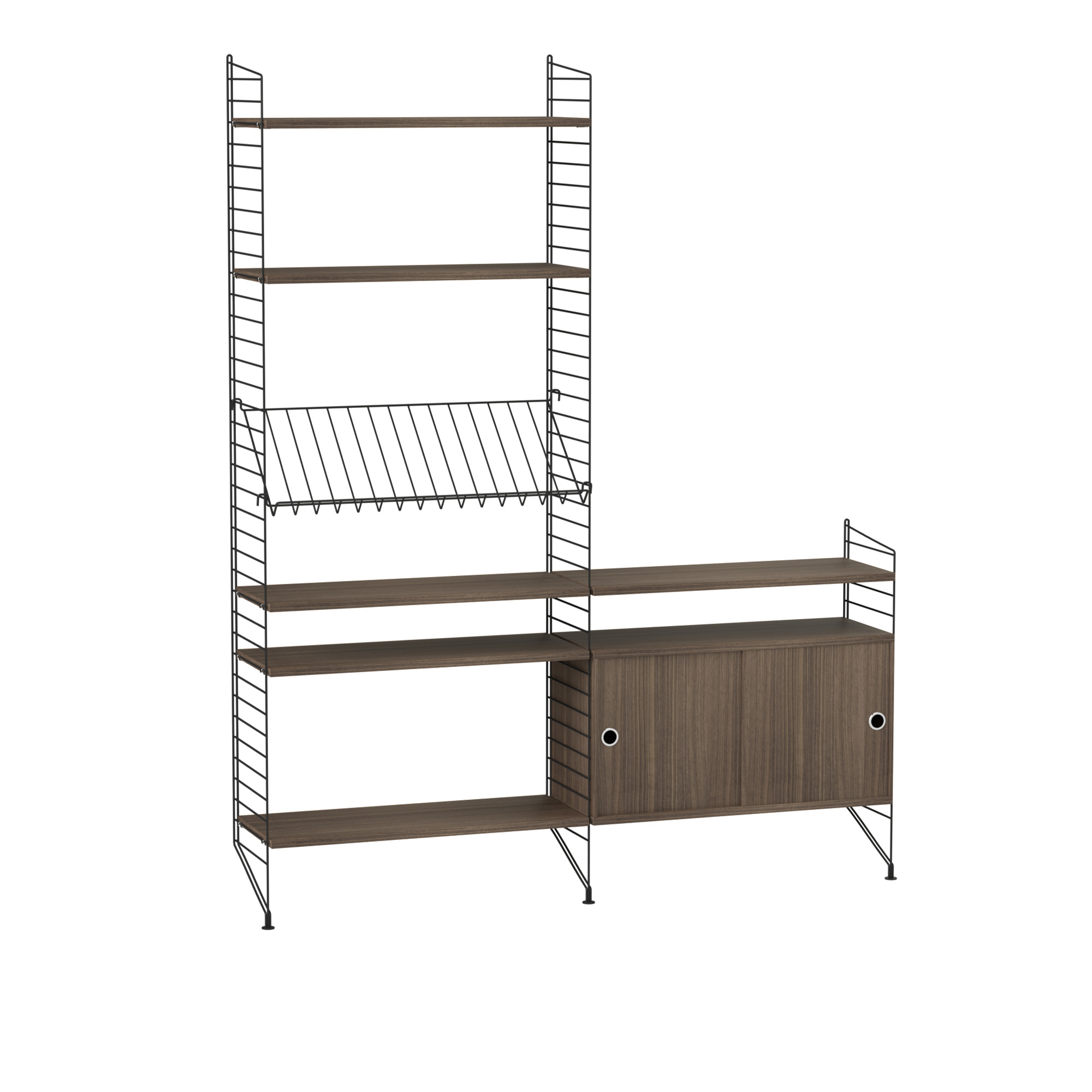 Vardagsrum Hyllsystem K från String erbjuder generösa förvaringsmöjligheter och flexibilitet. Hyllsystem K består av hyllor, tidningsställ och skåp med skjutdörrar, och är speciellt konfigurerat för att användning i vardagsrummet. Dess modulära design gör det möjligt att efter behov bygga ut och lägga till moduler, sektioner och tillbehör från Strings övriga sortiment. Finns tillgänglig i flera utföranden.