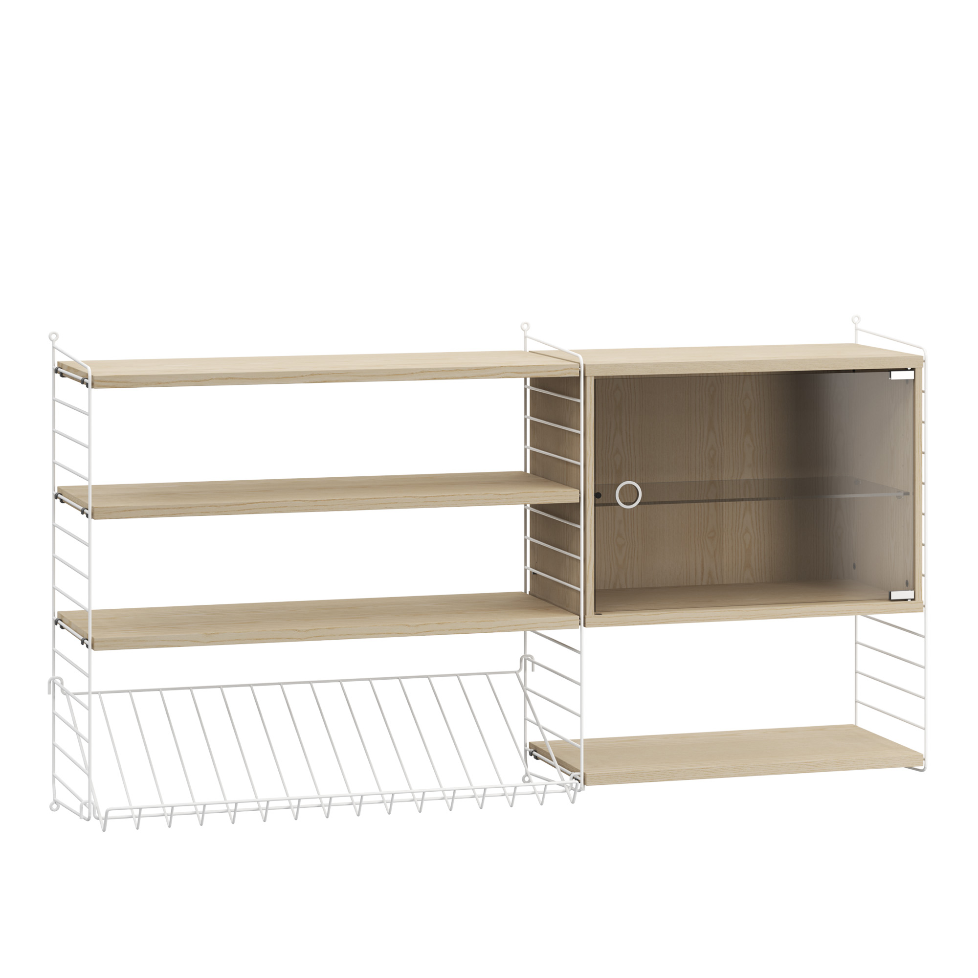 Vardagsrum Hyllsystem S är ett förvaringssystem från svenska String, bestående av hyllor, hyllplan och vitrinskåp med glasdörr. Hyllsystem S är ett vägghängt system som erbjuder generös förvaring och flexibiliteten att vid behov kunna utöka och lägga till sektioner, delar, hyllor, skåp och tillbehör från Strings ikoniska sortiment. Hyllsystemet mäter 30 cm djupt och finns tillgängligt i ett brett urval av utföranden och träslag.