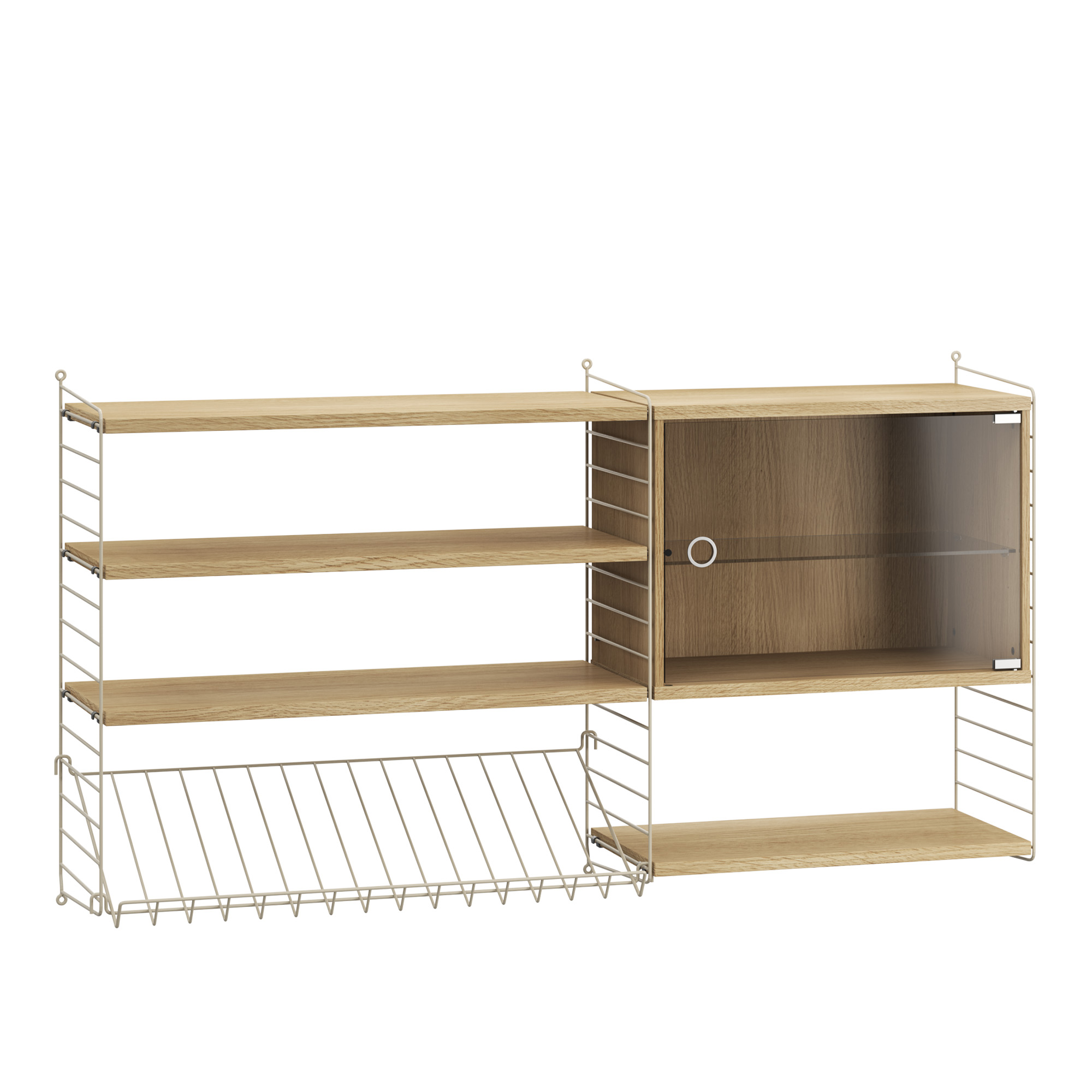 Vardagsrum Hyllsystem S är ett förvaringssystem från svenska String, bestående av hyllor, hyllplan och vitrinskåp med glasdörr. Hyllsystem S är ett vägghängt system som erbjuder generös förvaring och flexibiliteten att vid behov kunna utöka och lägga till sektioner, delar, hyllor, skåp och tillbehör från Strings ikoniska sortiment. Hyllsystemet mäter 30 cm djupt och finns tillgängligt i ett brett urval av utföranden och träslag.
