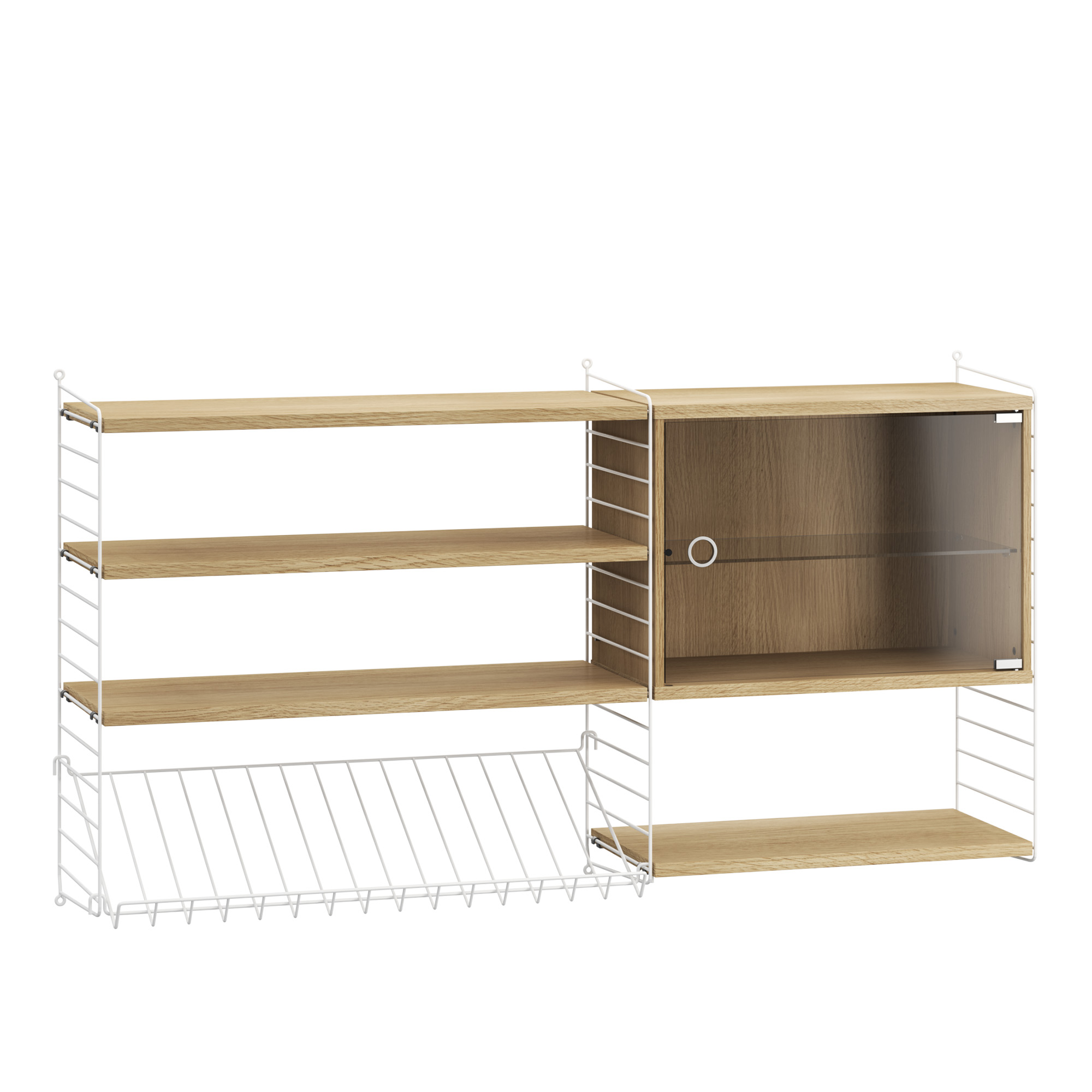 Vardagsrum Hyllsystem S är ett förvaringssystem från svenska String, bestående av hyllor, hyllplan och vitrinskåp med glasdörr. Hyllsystem S är ett vägghängt system som erbjuder generös förvaring och flexibiliteten att vid behov kunna utöka och lägga till sektioner, delar, hyllor, skåp och tillbehör från Strings ikoniska sortiment. Hyllsystemet mäter 30 cm djupt och finns tillgängligt i ett brett urval av utföranden och träslag.