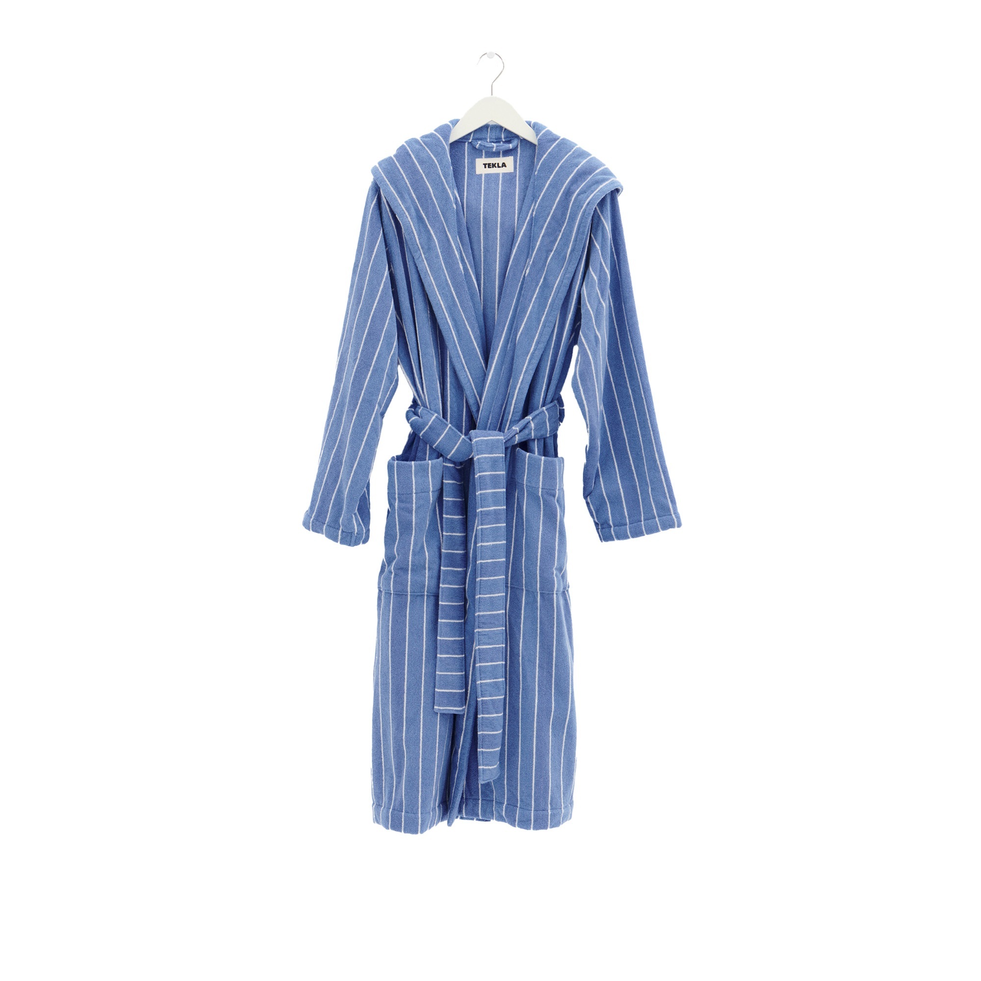 Terry Hooded Bathrobe Marseille från Tekla är en badrock tillverkad i mjuk och absorberande bomull. Den har en rymlig passform och en längre modell med sjalkrage, avtagbart bälte och stora fickor framtill. Basen i blått med vita ränder ger ett tidlöst uttryck. Badrocken är tillverkad av extra långa, tvinnade bomullsfibrer, vilket bidrar till hållbarhet och komfort. Med en tygvikt på 385 GSM är den både unisex och Oeko-Tex® Standard 100 certifierad. Tillverkad i Portugal för hög kvalitet och med miljöhänsyn.