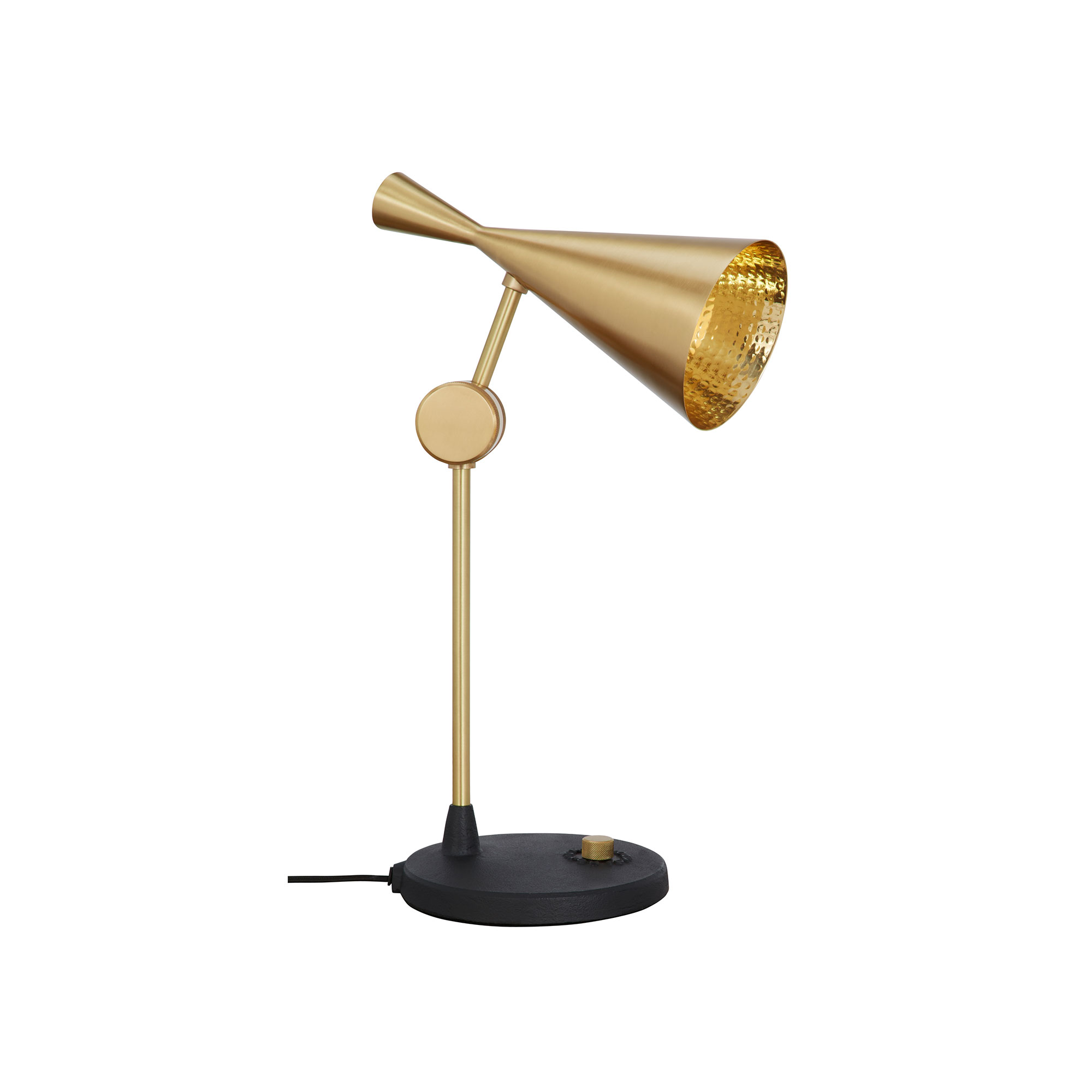 Beat Light Table, bordsslampa i mässing och gjutjärn från Tom Dixon. Inspirationen till Beat kommer från traditionella vattenkärl i Indien, vars skulpturala enkelhet har översatts till en elegant bordsslampa. Insidan av skärmen är knackad för hand, enligt traditionella indiska hantverksmetoder. Beat Light Table kommer i två utföranden, svartlackerad mässing och borstad mässing. Båda står på en rejäl fot av gjutjärn, där vi också finner av/på-knappen med inbyggd dimmer.