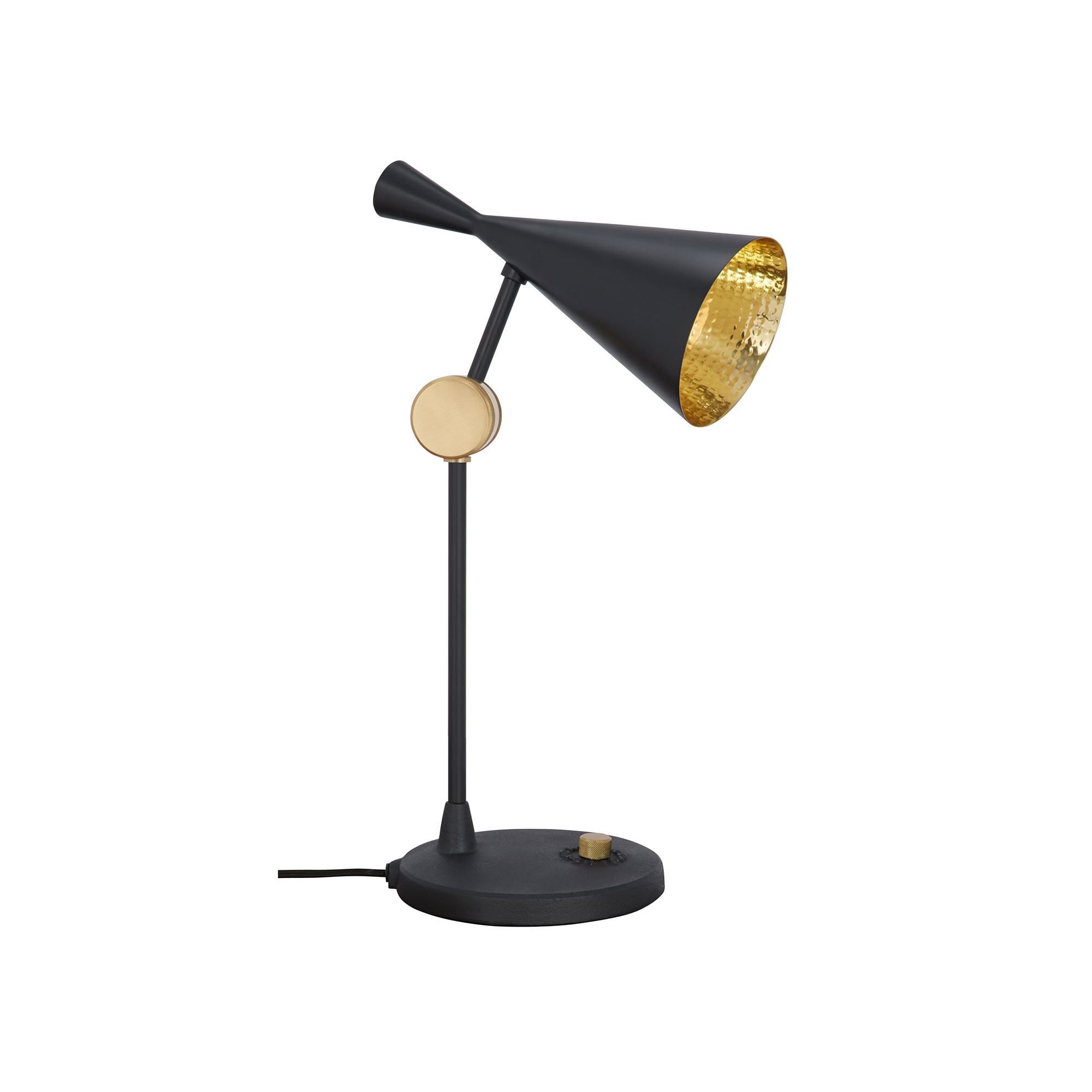 Beat Light Table, bordsslampa i mässing och gjutjärn från Tom Dixon. Inspirationen till Beat kommer från traditionella vattenkärl i Indien, vars skulpturala enkelhet har översatts till en elegant bordsslampa. Insidan av skärmen är knackad för hand, enligt traditionella indiska hantverksmetoder. Beat Light Table kommer i två utföranden, svartlackerad mässing och borstad mässing. Båda står på en rejäl fot av gjutjärn, där vi också finner av/på-knappen med inbyggd dimmer.