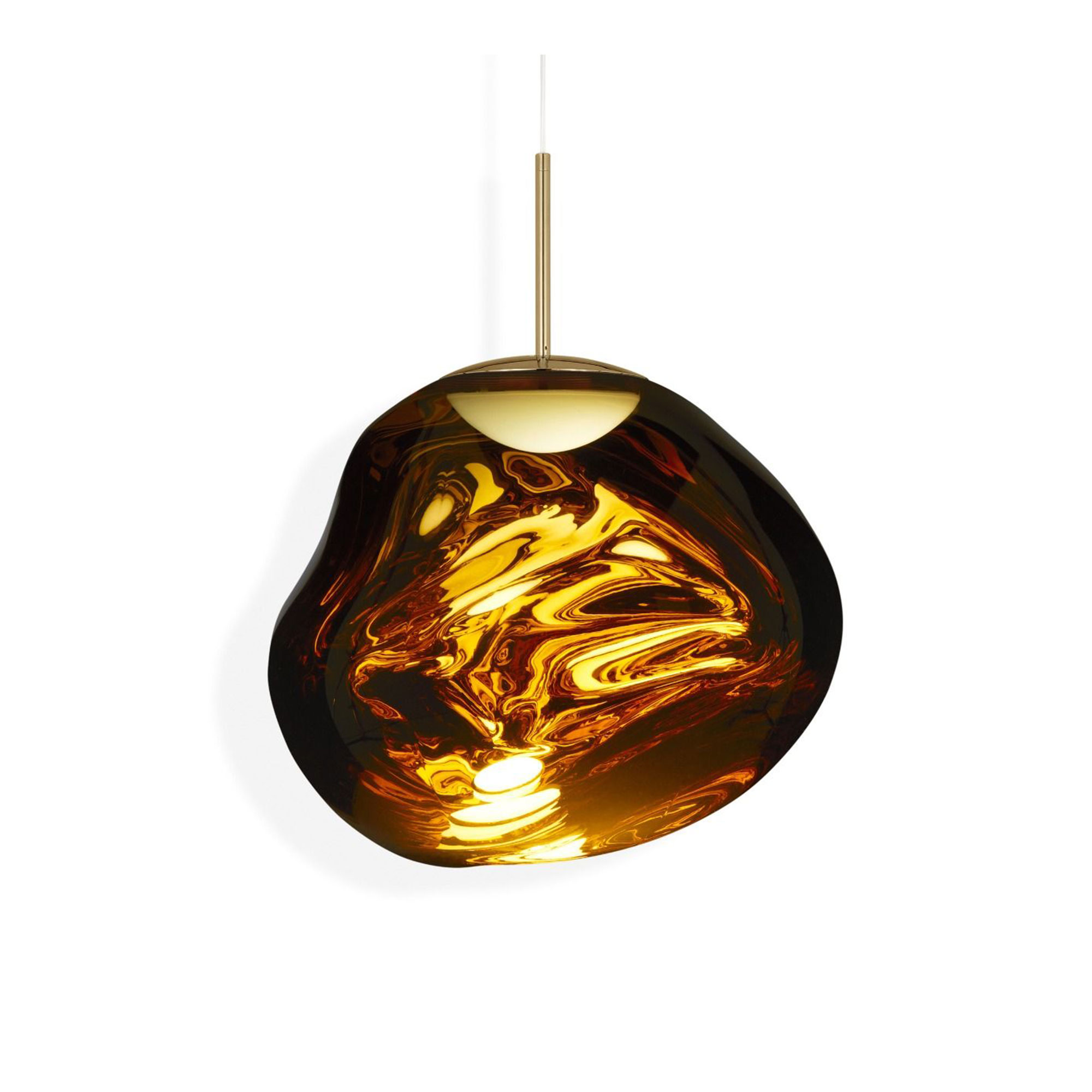 Med Melt Pendant har Tom Dixon tagit den avancerade processen med vakuummetallisering till en helt ny nivå. Melt togs fram i samarbete med det innovativa kvinnliga svenska designkollektivet Front. Ljuset reflekteras på sfärens ojämna yta och skapar då en dramatisk illusion av glödhett glas. Tänd är lampan genomskinlig, men släckt blir den helt spegelblank. Pendelns spännande skiftningar syns även i dagsljus. Melt Pendant kommer i två olika storlekar och i utförandena koppar, guld och krom.