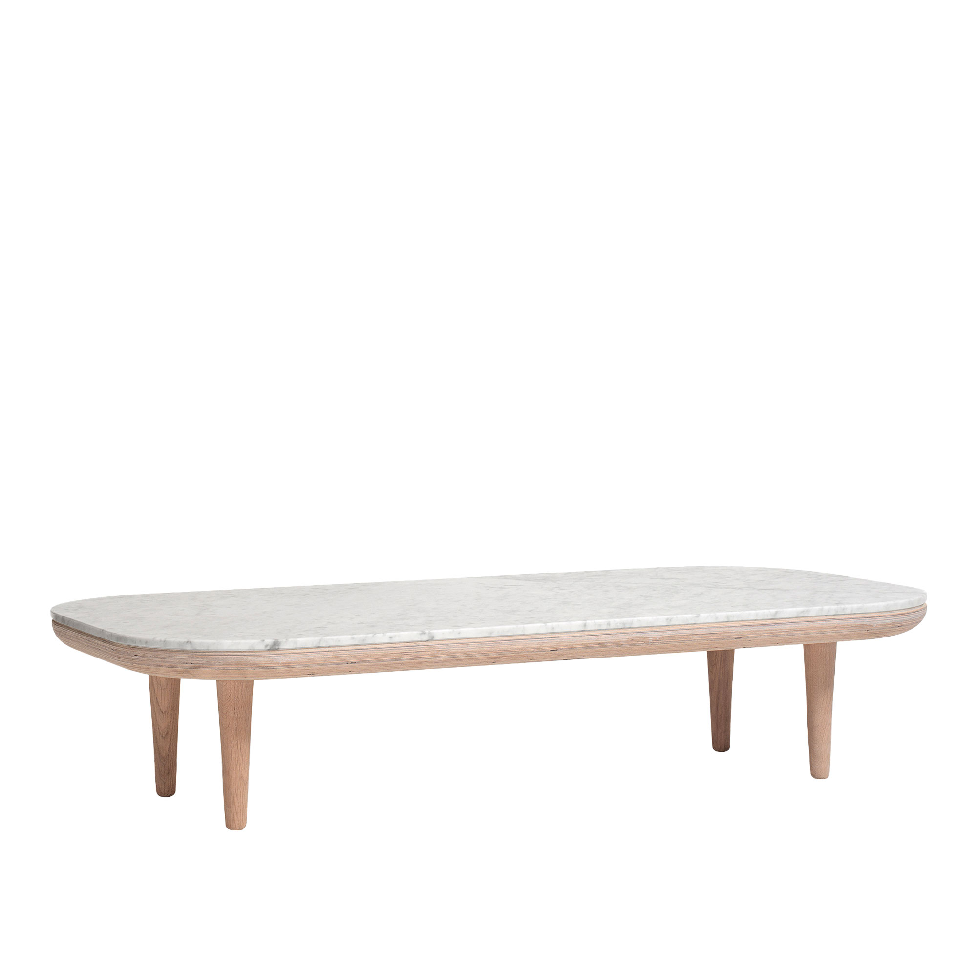 Fly, soffbord i ek och marmor formgivet av Space Copenhagen för &Tradition. De vackra naturmaterialen ek och marmor tillsammans med bordets mjuka kurvor gör Fly till ett bord som utstrålar lugn och värdighet. Ek, behandlad antingen med vitpigmenterad olja eller rökt olja och den robusta marmorn är den typen av material och behandling som åldras med grace och som bara blir vackrare med åren.