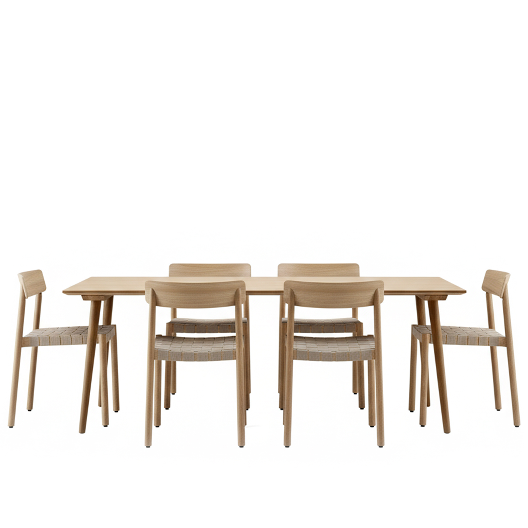 Kombinationen består av ett In Between SK5-matbord och fyra Betty TK1 stolar, eller ett In Between SK6-matbord och sex Betty TK1-stolar – samtliga möbler i massiv ek.