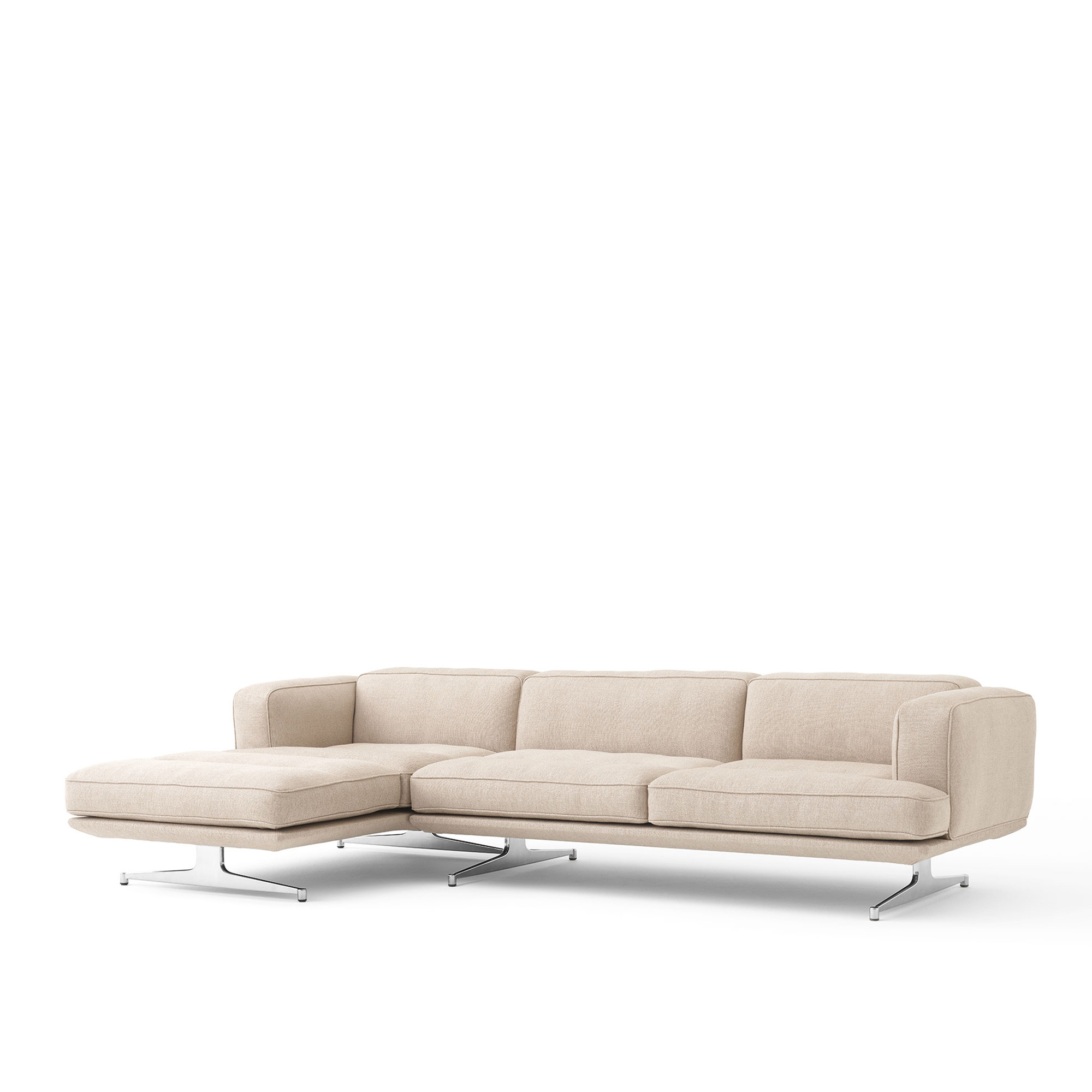 Inland Left Chaise Longue AV42 Polished aluminium legs från danska &Tradition är designad av Anderssen & Voll. Denna inbjudande soffa med schäslong hyllar de klassiska silhuetterna från formgivarnas norska arv i mitten av seklet, medan de mjuka kuddarna hämtar inspiration från mer överdådig italiensk design.