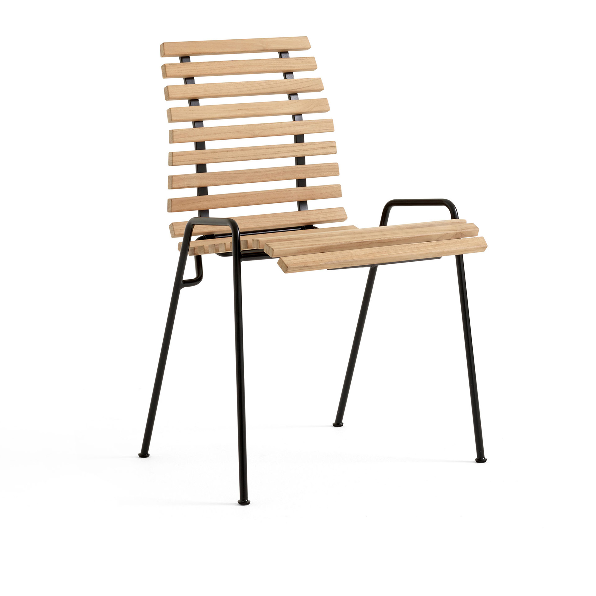 RFH Terrace Side Chair RD4 från &Tradition, designad av Robin Day för Royal Festival Halls terrass i London 1951. Stolen är tillverkad i teak och pulverlackerat stål och har ett enkelt formspråk med böljande ribbor i teak och smala, distinkta ben i svart. Den är lätt att placera i olika utomhusmiljöer.