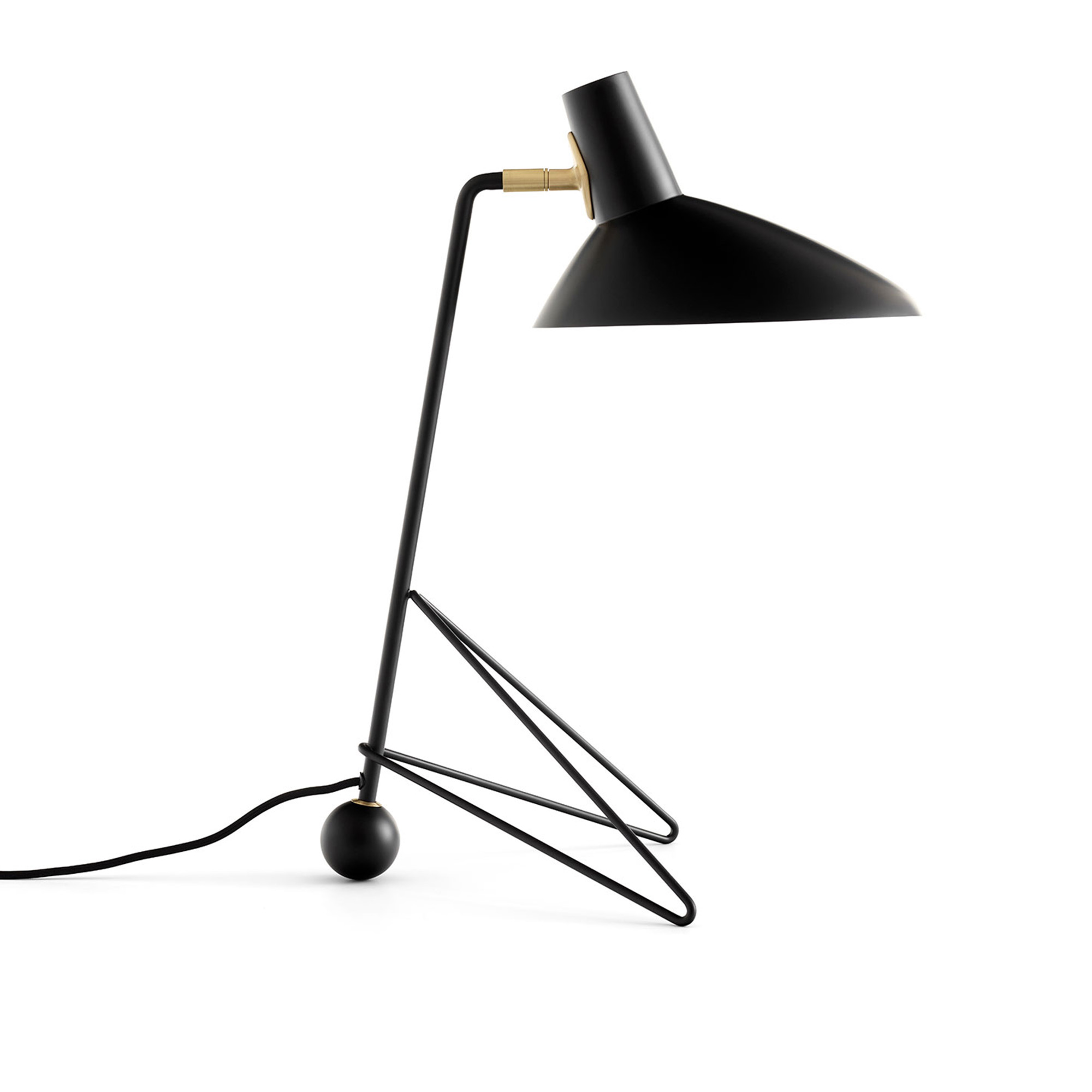 Tripod Table Lamp HM9 från danska &Tradition, formgiven av Hvidt & Mølgaard, 1953. Bordslampan är delikat balanserad med skarp enkelhet i kontrast till runda och böjda former i lackerad stål och mässingsdetaljer. Lampans skärm är vridbar så man kan rikta ljuset efter behov. I samma serie finns golvlampa och vägglampa.
