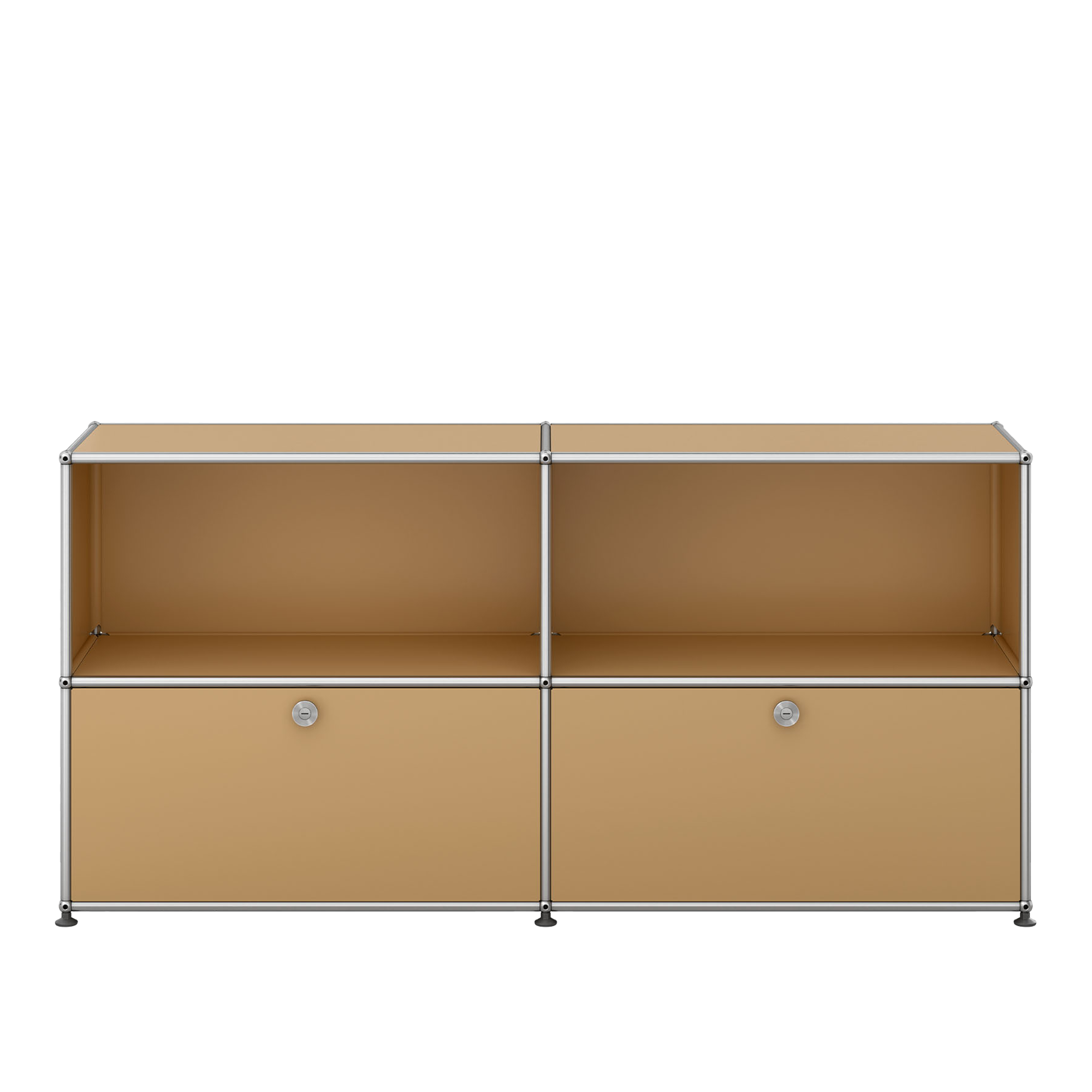 USM Haller C2 Sideboard är en sideboard-design skapad av duon Fritz Haller och Paul Schärer för företaget USM. Denna möbel är konstruerad med kromade metallrör som utgör stommen, medan de målade metallplåtarna utgör ytskikten. Modellen USM Haller C2 Sideboard innehåller två öppna utrymmen och är försedd med två nedfällbara dörrar. Den finns tillgänglig i ett urval av färger och håller sig trogen mot designestetiken som kännetecknar hela serien. Designkonceptet för USM Haller bygger på tre fundamentala komponenter: kulan, de förbindande rören och plåtpanelerna. Denna flexibla struktur tillåter konstruktion i olika dimensioner, demontering och återkonfigurering för att möta förändrade behov. För ytterligare anpassning kan modulerna kompletteras med element såsom dörrar, lådor och diverse inredningsdetaljer för effektiv organisering. Viktigt att notera är att USM:s möbler med lådor är säkerhetsförberedda för att undvika skador under frakt. Alla lådor är därför förslutna och kan enkelt öppnas genom att vrida på knoppen med ett lämpligt verktyg, som en skruvmejsel. Var dock aktsam så att inte möbelns yta skadas i processen.