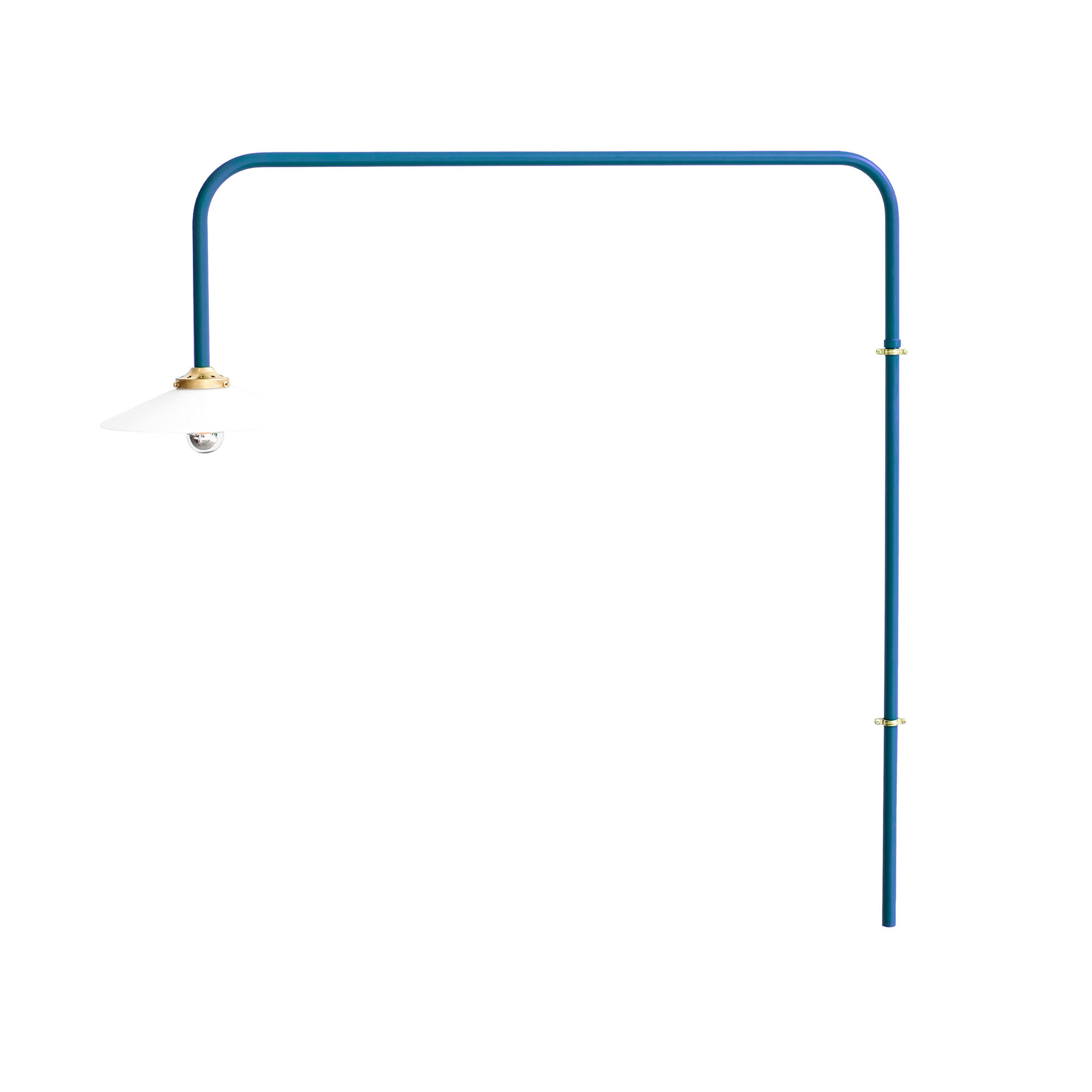 Hanging Lamp är en serie vägglampor från Valerie Objects, formgivna av Muller van Severen. Formspråket, med dess enkla linjer och mättade färgsättning, är lekfullt och personligt medan dess återhållsamma former ger ett sofistikerat och sobert intryck. Armaturen är tillverkad av pulverlackerad metall eller mässing och skärmens vita glas reflekterar ett behagligt sken. I serien ingår en rad lampor bestående av blandade geometriska former i lekfulla färgsättningar – ett sprudlande komplement till hemmets övriga inredning.