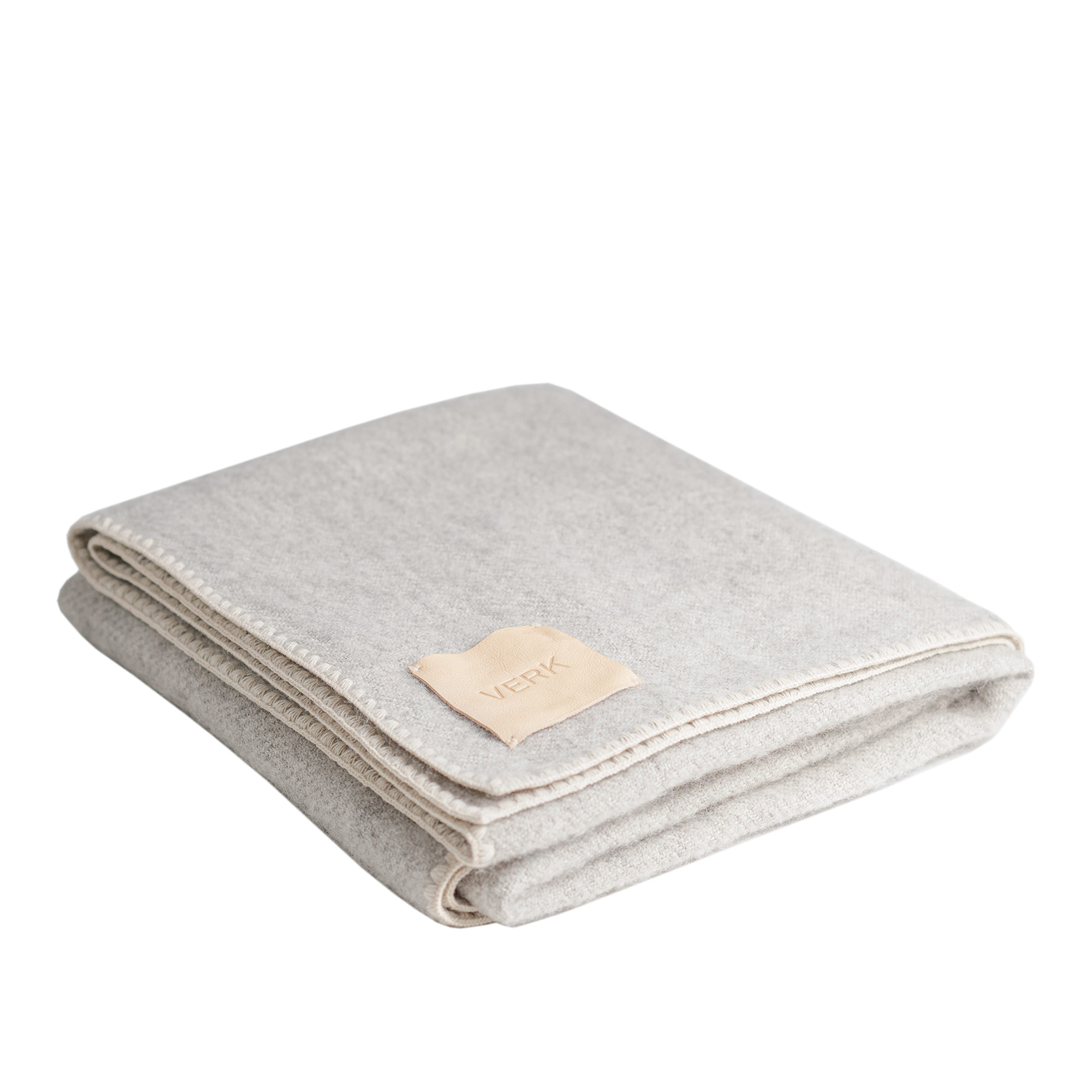 V.TP.01 är en mjuk grå/vit ullpläd från svenska Verk. Pläden är vävd i Sverige av svenskt ullgarn. Ullpläden har en ljusare konstrasterande stickning och en vacker detalj i naturfärgat läder.