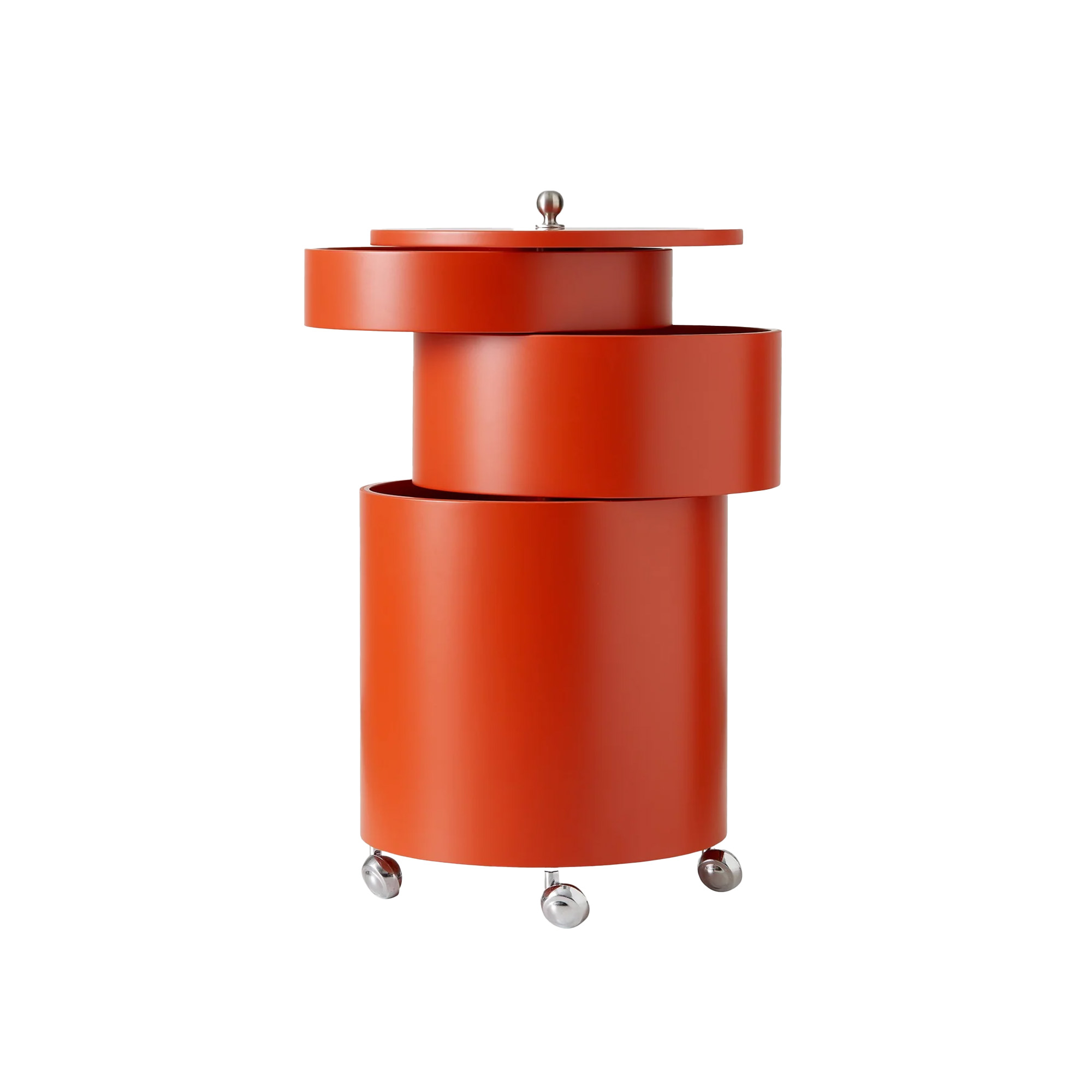Verner Pantons Barboy från Verpan är ett anpassningsbart sidobord och en mobil förvaringsmöbler i ett. Tillverkad i formad och lackerad MDF och försedd på med kromade metallhjul.