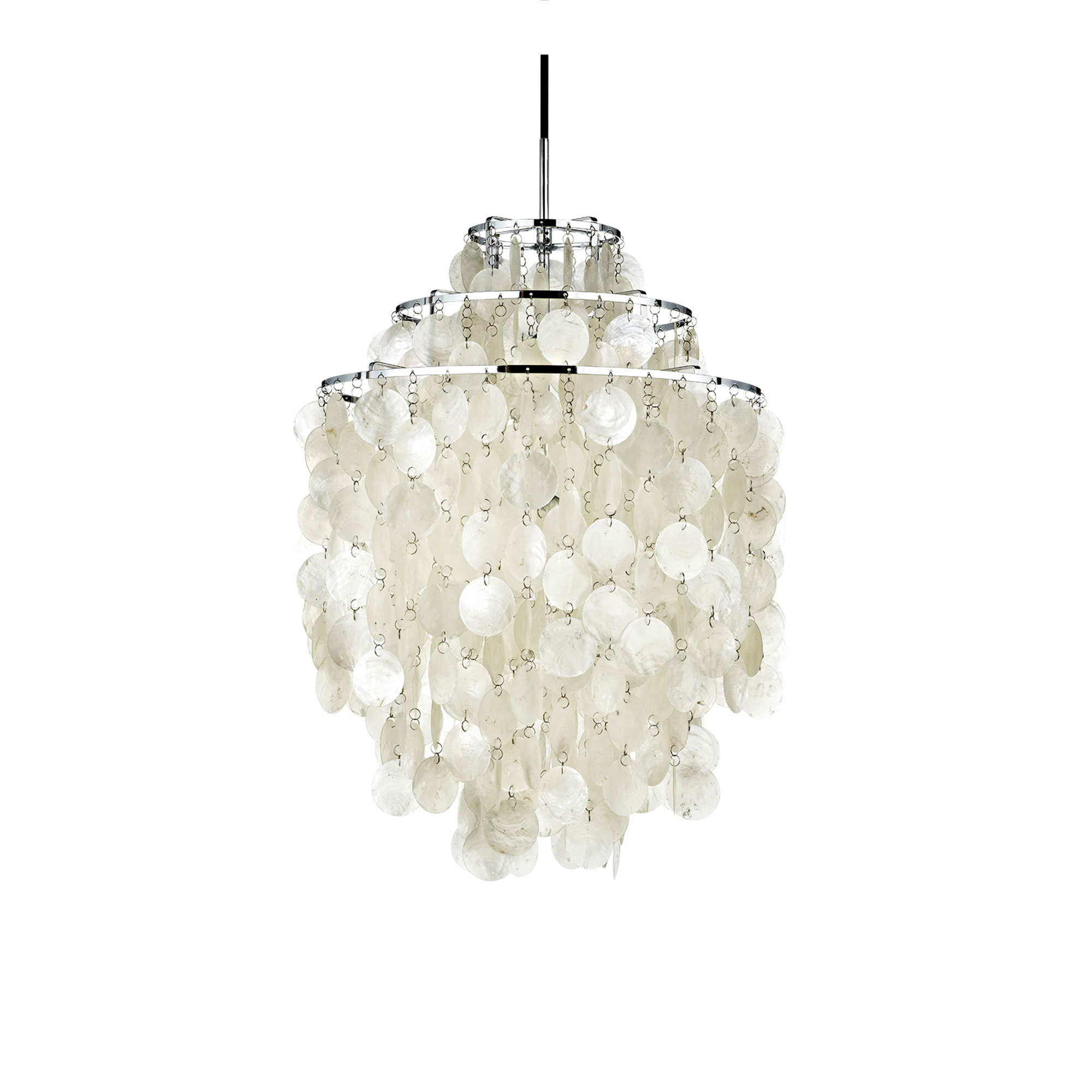 Den anmärkningsvärda pendellampan Fun 1DM är skapad av den välkända designikonen Verner Panton. Denna belysningsarmatur är sammansatt av delikata pärlemorplattor i formen av marina snäckskal, vilka är upphängda i cirkelformade strukturer av rostfritt stål. Strukturen och takkopplingen är tillverkade av krombelagd metall. Med sin distinkta och sofistikerade estetik har Fun 1DM förmågan att förvandla vilken miljö den än placeras i. Plattorna av pärlemor bidrar till ett dynamiskt ljusspel och skapar en harmonisk atmosfär genom sitt ljud när de rör sig. Denna lampa passar perfekt att hänga i entrén, sovrummet eller som ett elegant inslag över matbordet.