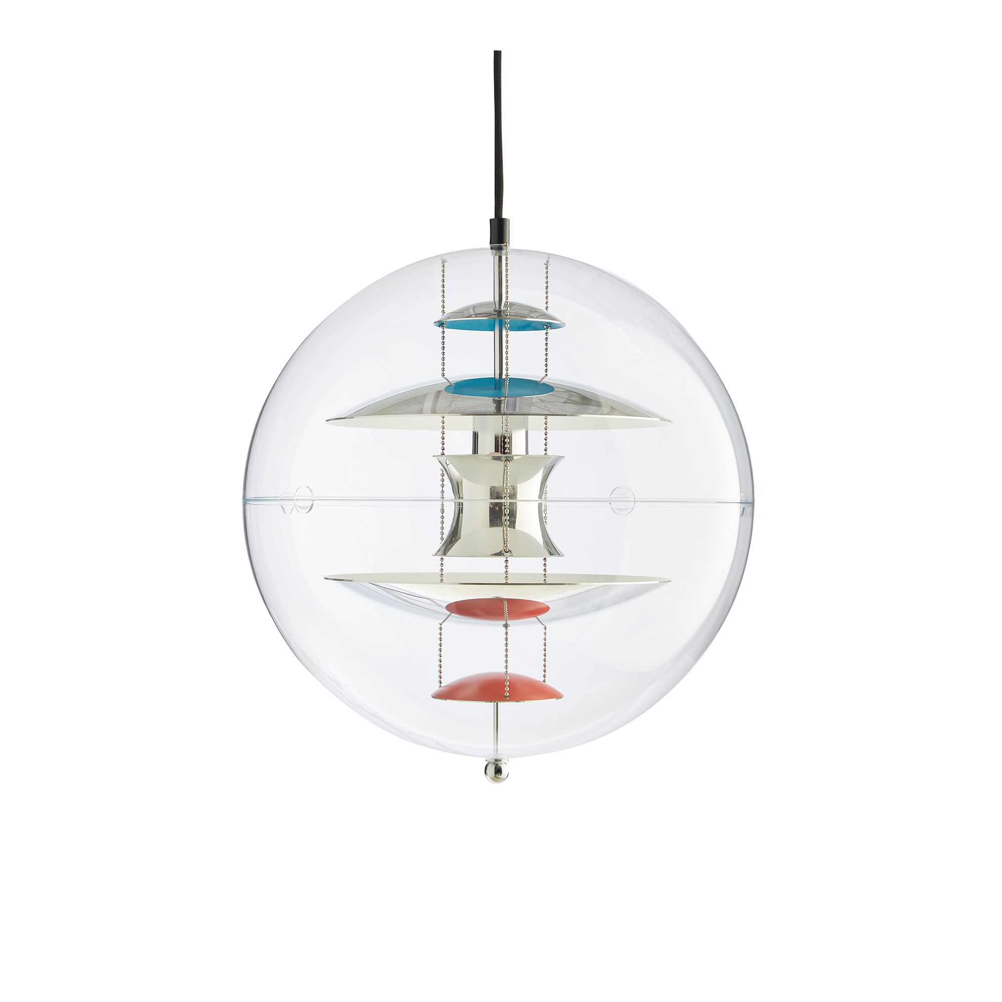 VP Globe Pendant Ø28 cm är en pendellampa formgiven av Verner Panton för varumärket Verpan. Det är en dekorativ pendellampa med en yttre sfär av transparent akryl och fem interna reflektorer upphängda med tre stålkedjor. Röda och blå inslag i designen förstärker det futuristiska formspråket som är typiskt för Panton. Lampan är utformad för att fånga blicken och skapa en enhetlig känsla i rummet, oavsett om den hänger ensam eller i grupp. Lampans reflektorer är tillverkade i aluminium, vilket bidrar till dess unika uttryck. Passar väl i hallar, korridorer eller som en skulptural detalj i ett hörn.